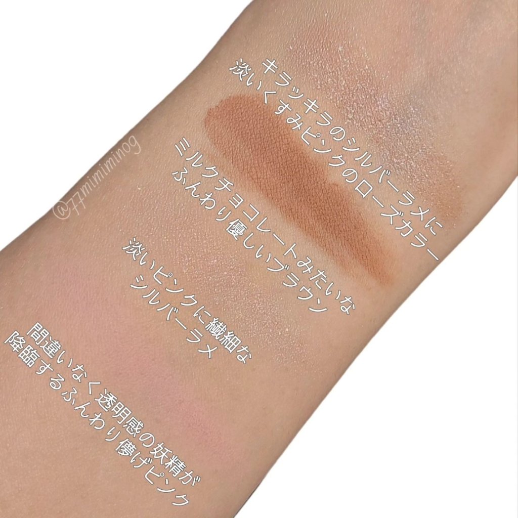 RMKのアイシャドウはこれがデビュー。こんなんブルベホイホイじゃん…。かわいすぎて即予約電話したわ🫠🩷 青みピンクに透明感爆発パープルにキラキララメ。締め色はグレージュっぽいブラウン。ブルベ大歓喜。 発色は調整しやすい。ピンクも見た目はビビッドだけど、ふんわり色づくので、好みの濃さにできるよ。