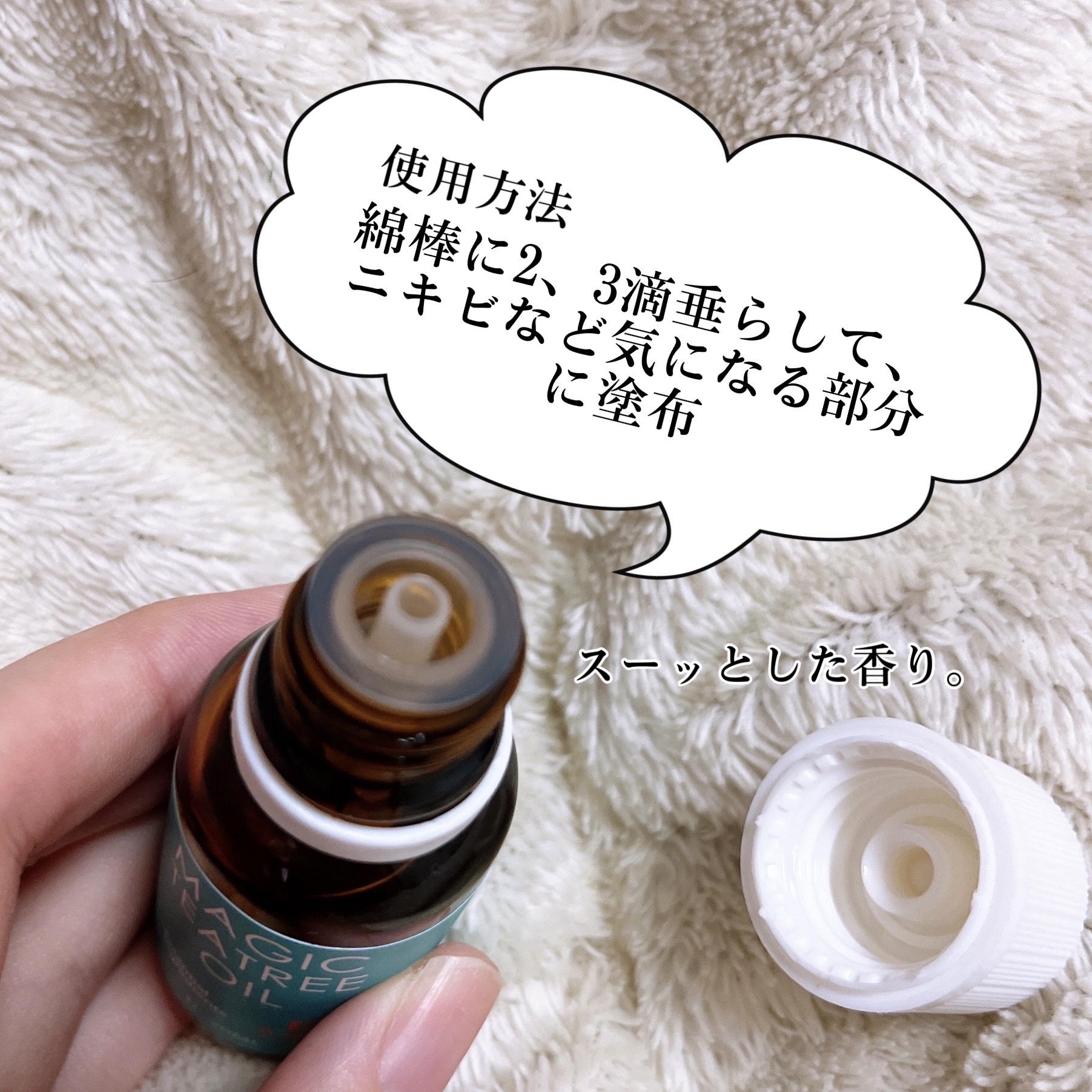 - マジックティーツリーオイルは、乾燥や皮脂による肌悩みをスポットケアし、整える商品です。ブラン代表の整肌成分である4‐テルピネオールで肌トラブルの原因の1つである皮脂を素早くケアします。 【このような方におススメ】 ✔乾燥による肌悩みが気になる方 ✔過度な皮脂と油分が気になる方 ✔べたつきのないスキンケアを探されている方 ✔肌荒れを防ぎたい方 ✔年齢性別肌タイプ関係なく使用できる商品を探されている方 【使用方法】 ①洗顔後、コットンに適量を取り、軽くふき取った後馴染ませます。 ②気になる部分の肌をきれいに洗顔後、トナー→クリームの順でお肌を整えます。 ③綿棒に1~2滴落とし、気になる部分に塗ります。 経過を見て朝晩のスキンケアの最後の段階に塗ることを繰り返します。