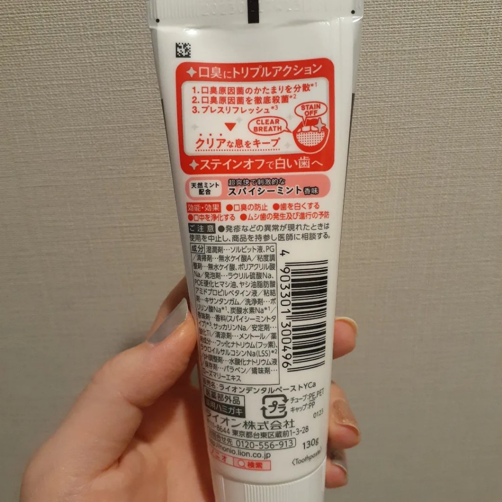 - クリアハーブミント 湿潤剤:ソルビット液、PG 清掃剤:無水ケイ酸A 粘度調整剤:無水ケイ酸、ポリアクリル酸Na 発泡剤:ラウリル硫酸Na、POE硬化ヒマシ油、ヤシ油脂肪酸アミドプロピルベタイン液 粘結剤:キサンタンガム 洗浄剤:ポリリン酸Na、炭酸水素Na 香味剤:香料(クリアハーブミントタイプ)、サッカリンNa 安定剤:酸化Ti 清涼剤:メントール 薬用成分:フッ化ナトリウム(フッ素)、ラウロイルサルコシンNa(LSS) pH調整剤:水酸化ナトリウム液 保存剤:パラベン 矯味剤:ローズマリーエキス ピュアリーミント 湿潤剤:ソルビット液、PG 清掃剤:無水ケイ酸A 粘度調整剤:無水ケイ酸、ポリアクリル酸Na 発泡剤:ラウリル硫酸Na、POE硬化ヒマシ油、ヤシ油脂肪酸アミドプロピルベタイン液 粘結剤:キサンタンガム 洗浄剤:ポリリン酸Na、炭酸水素Na 香味剤:香料(ピュアリーミントタイプ)、サッカリンNa 安定剤:酸化Ti 清涼剤:メントール 薬用成分:フッ化ナトリウム(フッ素)、ラウロイルサルコシンNa(LSS) pH調整剤:水酸化ナトリウム液 保存剤:パラベン 矯味剤:ローズマリーエキス スプラッシュシトラスミント 湿潤剤:ソルビット液、PG 清掃剤:無水ケイ酸A 粘度調整剤:無水ケイ酸、ポリアクリル酸Na 発泡剤:ラウリル硫酸Na、POE硬化ヒマシ油、ヤシ油脂肪酸アミドプロピルベタイン液 粘結剤:キサンタンガム 洗浄剤:ポリリン酸Na、炭酸水素Na 香味剤:香料(スプラッシュシトラスミントタイプ)、サッカリンNa 安定剤:酸化Ti 清涼剤:メントール 薬用成分:フッ化ナトリウム(フッ素)、ラウロイルサルコシンNa(LSS) pH調整剤:水酸化ナトリウム液 保存剤:パラベン 矯味剤:ローズマリーエキス
