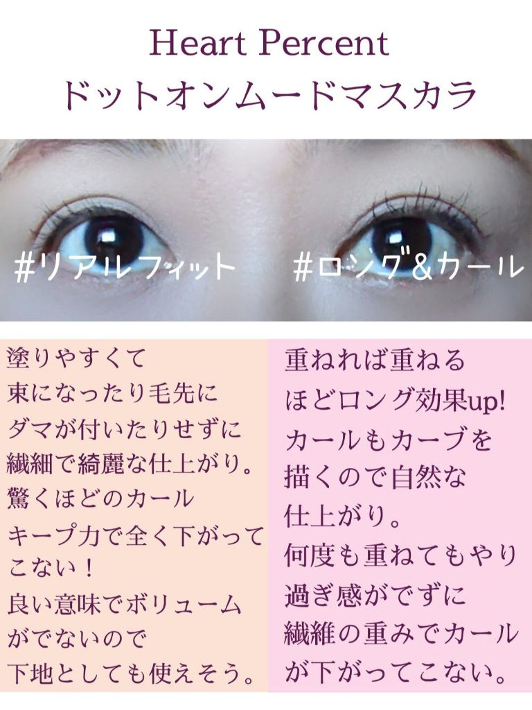 レビュードットオンムードマスカラロングアンドカールHeartPercent¥[簡単な商品説明]繊維入りでスッと伸びる繊細まつ毛が作れるブラックマスカラ。[全体評価]★★★★☆[パッケージ]★★★★☆おしゃれなパッケージ。円柱だから転がる。[色...