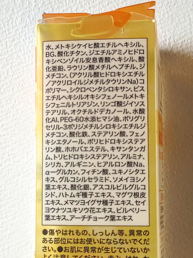 - <01 透明> 水、メトキシケイヒ酸エチルヘキシル、BG、ジエチルアミノヒドロキシベンゾイル安息香酸ヘキシル、酸化亜鉛、ラウリン酸メチルへプチル、酸化チタン、ジメチコン、(アクリル酸ヒドロキシエチル/アクリロイルジメチルタウリンNa)コポリマー、シクロペンタシロキサン、ビスエチルヘキシルオキシフェノールメトキシフェニルトリアジン、リンゴ酸ジイソステアリル、水酸化Al、PEG-60水添ヒマシ油、ステアリン酸、フェノキシエタノール、ポリグリセリル-3ポリジメチルシロキシエチルジメチコン、ポリヒドロキシステアリン酸、ホホバエステル、キサンタンガム、アルギニン、ヒアルロン酸Na、α-グルカン、フィチン酸、ユキノシタエキス、グルコシルセラミド、ソメイヨシノ葉エキス、ハトムギ種子エキス、マグワ根皮エキス、メマツヨイグサ種子エキス、酸化銀、セイヨウナツユキソウ花エキス、ビルベリー葉エキス、アーチチョーク葉エキス <02 ホワイト> 水、メトキシケイヒ酸エチルヘキシル、BG、酸化チタン、ジエチルアミノヒドロキシベンゾイル安息香酸ヘキシル、酸化亜鉛、ラウリン酸メチルへプチル、ジメチコン、(アクリル酸ヒドロキシエチル/アクリロイルジメチルタウリンNa)コポリマー、シクロペンタシロキサン、ビスエチルヘキシルオキシフェノールメトキシフェニルトリアジン、リンゴ酸ジイソステアリル、オクチルドデカノール、水酸化Al、PEG-60水添ヒマシ油、ポリグリセリル-3ポリジメチルシロキシエチルジメチコン、ステアリン酸、フェノキシエタノール、ポリヒドロキシステアリン酸、ホホバエステル、キサンタンガム、トリヒドロキシステアリン、アルミナ、シリカ、アルギニン、ヒアルロン酸Na、α-グルカン、フィチン酸、ユキノシタエキス、グルコシルセラミド、ソメイヨシノ葉エキス、ハトムギ種子エキス、マグワ根皮エキス、メマツヨイグサ種子エキス、酸化銀、セイヨウナツユキソウ花エキス、ビルベリー葉エキス、アーチチョーク葉エキス <C01 CICAミント> 水、メトキシケイヒ酸エチルヘキシル、BG、ジエチルアミノヒドロキシベンゾイル安息香酸ヘキシル、酸化チタン、酸化亜鉛、ラウリン酸メチルへプチル、ジメチコン、(アクリル酸ヒドロキシエチル/アクリロイルジメチルタウリンNa)コポリマー、シクロペンタシロキサン、ビスエチルヘキシルオキシフェノールメトキシフェニルトリアジン、リンゴ酸ジイソステアリル、オクチルドデカノール、水酸化Al、PEG-60水添ヒマシ油、ポリグリセリル-3ポリジメチルシロキシエチルジメチコン、ステアリン酸、フェノキシエタノール、ポリヒドロキシステアリン酸、ホホバエステル、香料、キサンタンガム、酸化鉄、グンジョウ、トリヒドロキシステアリン、アルミナ、トリイソステアリン酸ポリグリセリル-2、青1、シリカ、アルギニン、ヒアルロン酸Na、α-グルカン、フィチン酸、ユキノシタエキス、グルコシルセラミド、ソメイヨシノ葉エキス、酸化銀、ハトムギ種子エキス、マグワ根皮エキス、メマツヨイグサ種子エキス、トコフェロール、セイヨウナツユキソウ花エキス、ビルベリー葉エキス、ツボクサ葉エキス、アーチチョーク葉エキス <C03 ピュアパープル> 水、メトキシケイヒ酸エチルヘキシル、BG、酸化チタン、ジエチルアミノヒドロキシベンゾイル安息香酸ヘキシル、酸化亜鉛、ラウリン酸メチルへプチル、ジメチコン、(アクリル酸ヒドロキシエチル/アクリロイルジメチルタウリンNa)コポリマー、シクロペンタシロキサン、エチルヘキサン酸セチル、ビスエチルヘキシルオキシフェノールメトキシフェニルトリアジン、リンゴ酸ジイソステアリル、オクチルドデカノール、水酸化Al、PEG-60水添ヒマシ油、ポリグリセリル-3ポリジメチルシロキシエチルジメチコン、ステアリン酸、フェノキシエタノール、ポリヒドロキシステアリン酸、ホホバエステル、トリイソステアリン酸ポリグリセリル-2、キサンタンガム、トリヒドロキシステアリン、青1、赤226、アルミナ、ナイアシンアミド、シリカ、アルギニン、ヒアルロン酸Na、α-グルカン、フィチン酸、ユキノシタエキス、グルコシルセラミド、ソメイヨシノ葉エキス、マグワ根皮エキス、酸化銀、ハトムギ種子エキス、メマツヨイグサ種子エキス、セイヨウナツユキソウ花エキス、ビルベリー葉エキス、アーチチョーク葉エキス <C02 サニーイエロー> 水、メトキシケイヒ酸エチルヘキシル、BG、酸化チタン、ジエチルアミノヒドロキシベンゾイル安息香酸ヘキシル、酸化亜鉛、ラウリン酸メチルへプチル、ジメチコン、(アクリル酸ヒドロキシエチル/アクリロイルジメチルタウリンNa)コポリマー、シクロペンタシロキサン、ビスエチルヘキシルオキシフェノールメトキシフェニルトリアジン、リンゴ酸ジイソステアリル、オクチルドデカノール、水酸化Al、PEG-60水添ヒマシ油、ポリグリセリル-3ポリジメチルシロキシエチルジメチコン、酸化鉄、ステアリン酸、フェノキシエタノー
