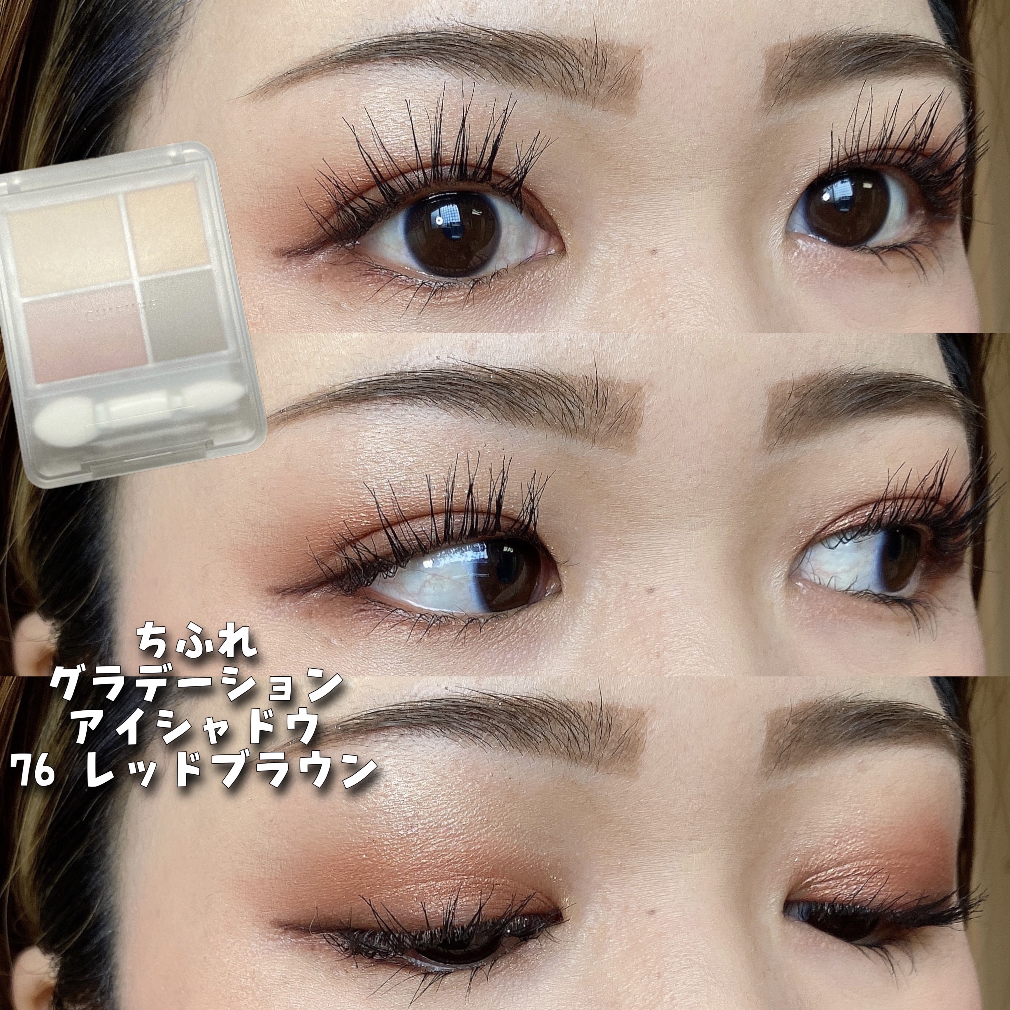 本日のアイシャドウ♡#ちふれ#グラデーションアイシャドウ36ブラウンパープル76レッドブラウンを、使いました。36ブラウンパープルのパープルを二重幅まで。76レッドブラウンのレッドを、ほんのりまぶたと下まつげのキワに。まぶたのラメには、36ブ...