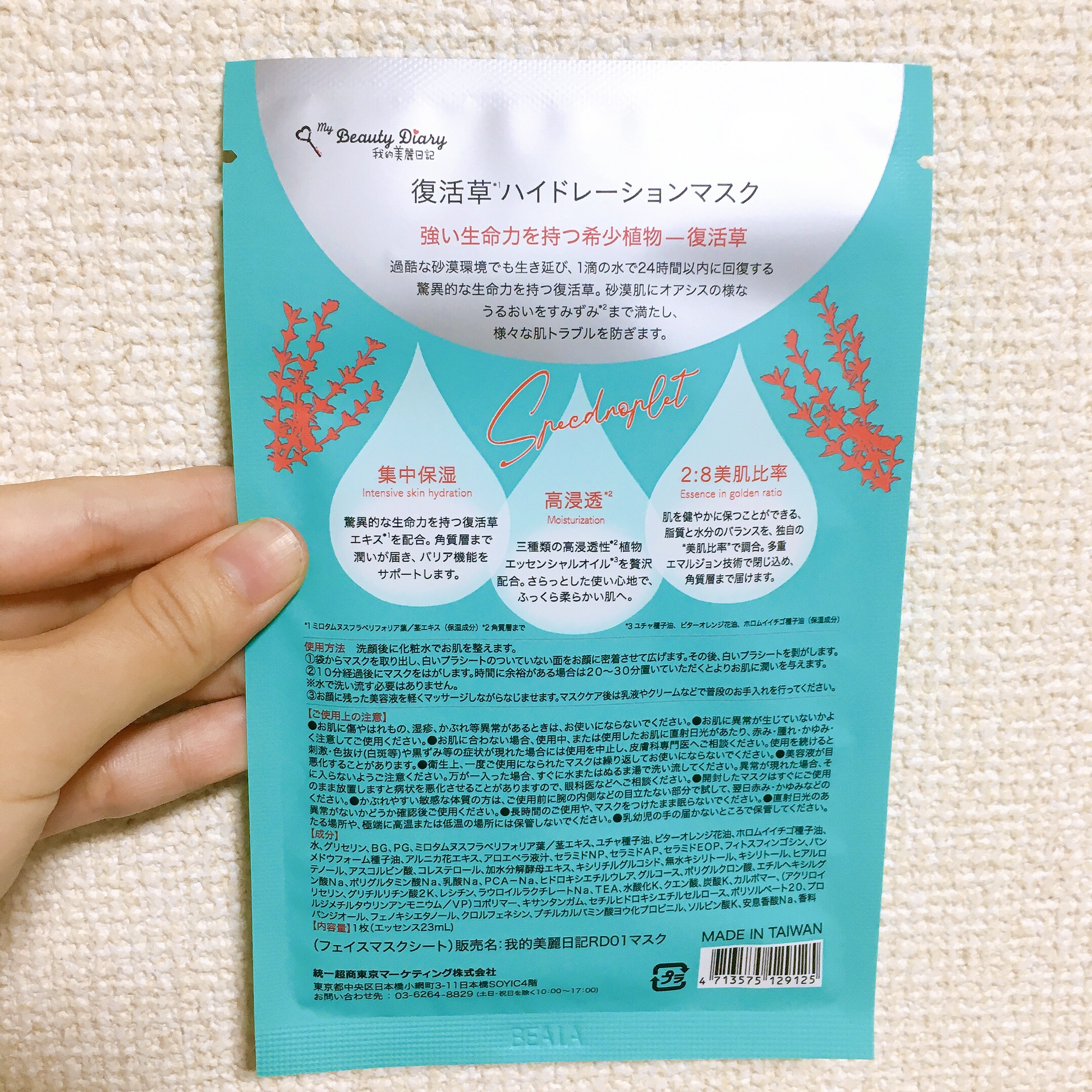 #購入品台湾コスメの我的美麗日記(私のキレイ日記)のシートマスクを使ってみました☺️✨『復活草ハイドレーションマスク』3枚入748円強い生命力を持つ希少植物「復活草」に着目した保湿シートマスク💧✨さらに3種のセラミドとビタミンC誘導体などを配...