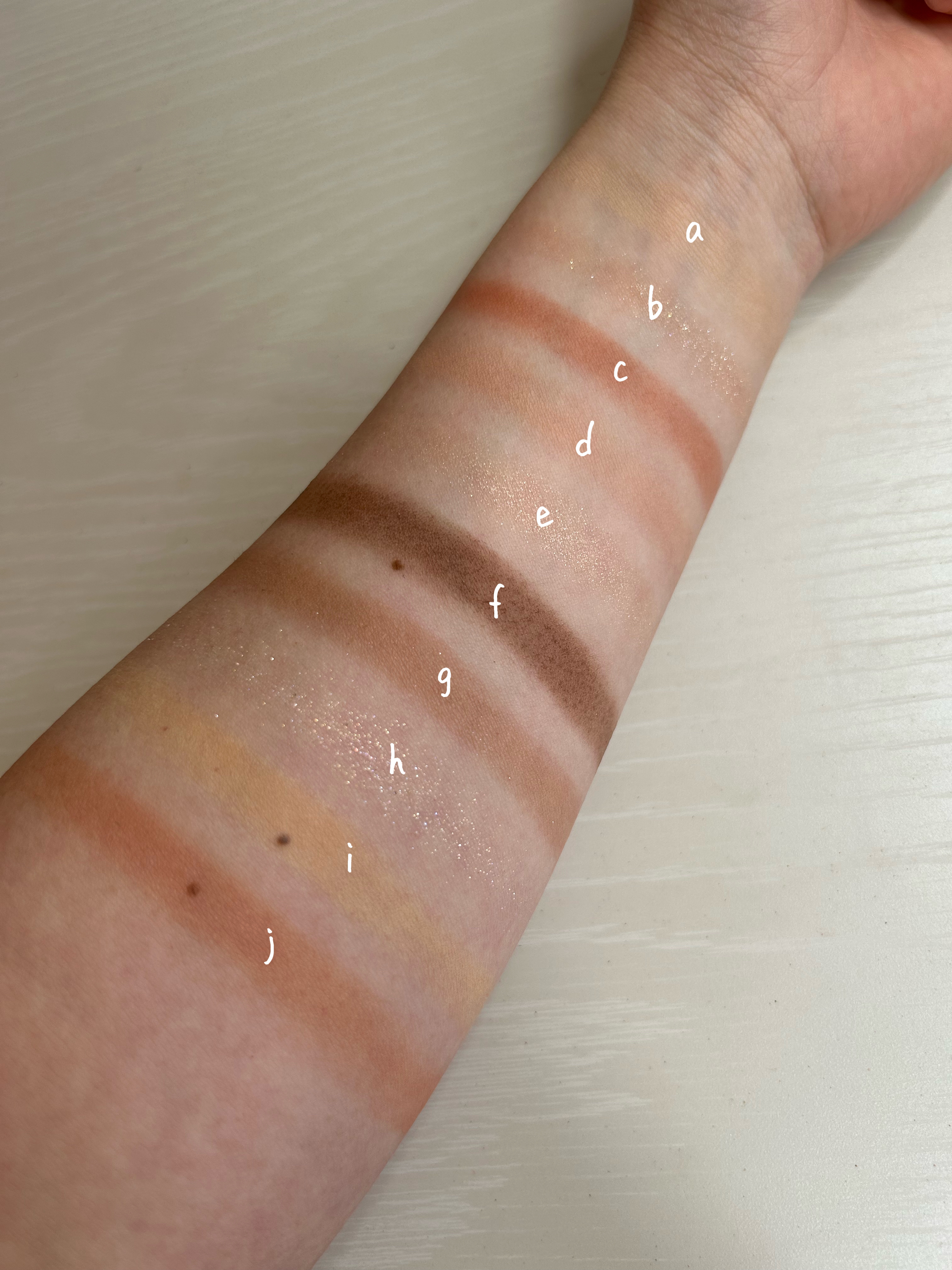 まずアイシャドウ!なんてかわいいオレンジなんでしょう🧡 bの色がボルドーっぽく見えますが、こちらもかなりオレンジで全体的にピンクオレンジのパレットです 粉が柔らかい(ブラシに付きやすい)ので指やチップで塗った方が良さそうだなと思いました💭 粉が柔らかい分、若干顔に落ちやすいというかラメ飛びしやすい感じはありましたが、ほっぺがキラキラになってしまう、、という程では無いので私はあまり気になりませんでした😌 そしてチーク!これがまた好みすぎました〜! スウォッチは色が分かるように数回重ねているのでかなり淡めの発色で使いやすいです✨ 画像よりもピンク感があるかなと思います 肌なじみのいい色でこれから大活躍してくれそうです パールも混ざっているので自然とツヤ肌に仕上がります