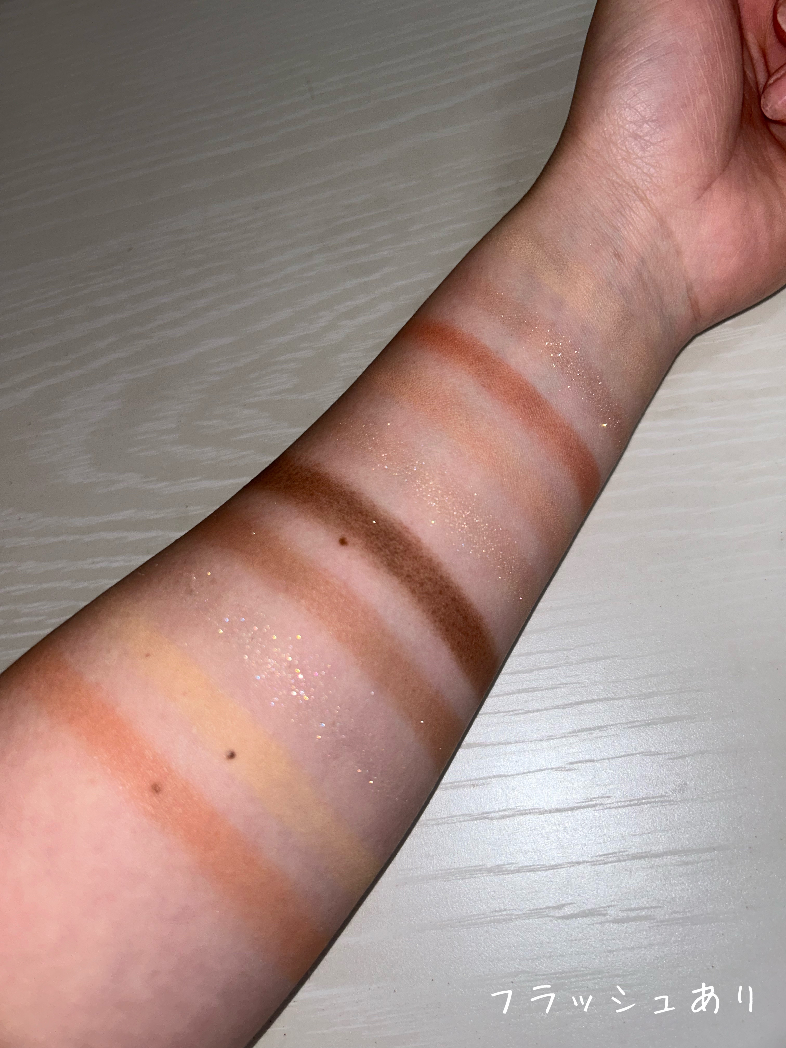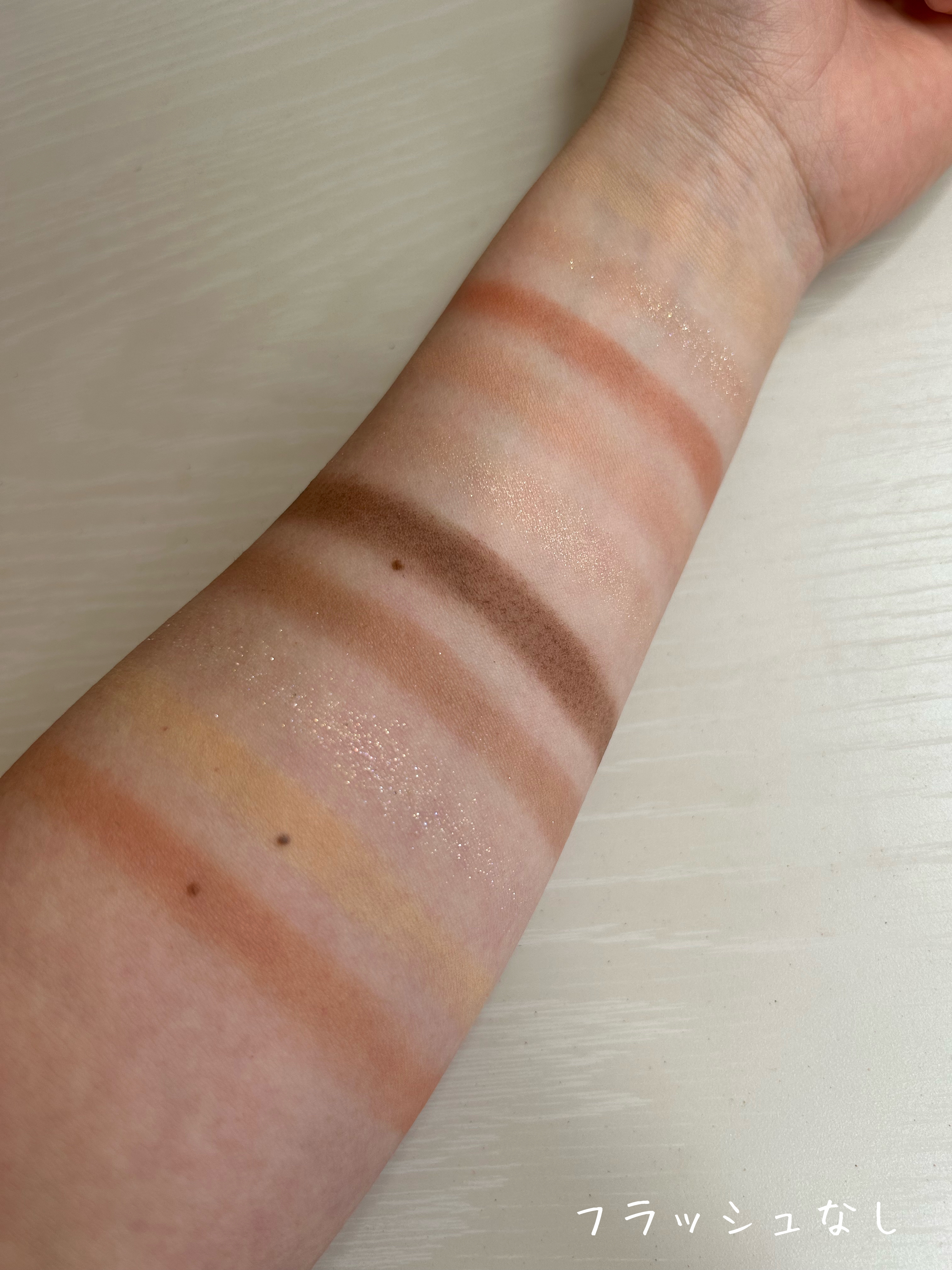とにっかく!4色どれをとっても春にピッタリでめちゃくちゃ可愛いです🤍 華やかだけど他の色を引き立ててくれるゴールドイエローのラメ、ほんのり主張の春っぽピンク、主役のオレンジ、締め色ブラウンと本っ当に全色かわいいです!! 全体的に発色が弱めかなと思います😢 何回も塗り重ねないといけないのと、夜まで朝の仕上がりが持たないところが少し残念です、、🥲 ただ配色はほんっっっとうにかわいいのでアイシャドウベースなどを使って工夫したいところです、、