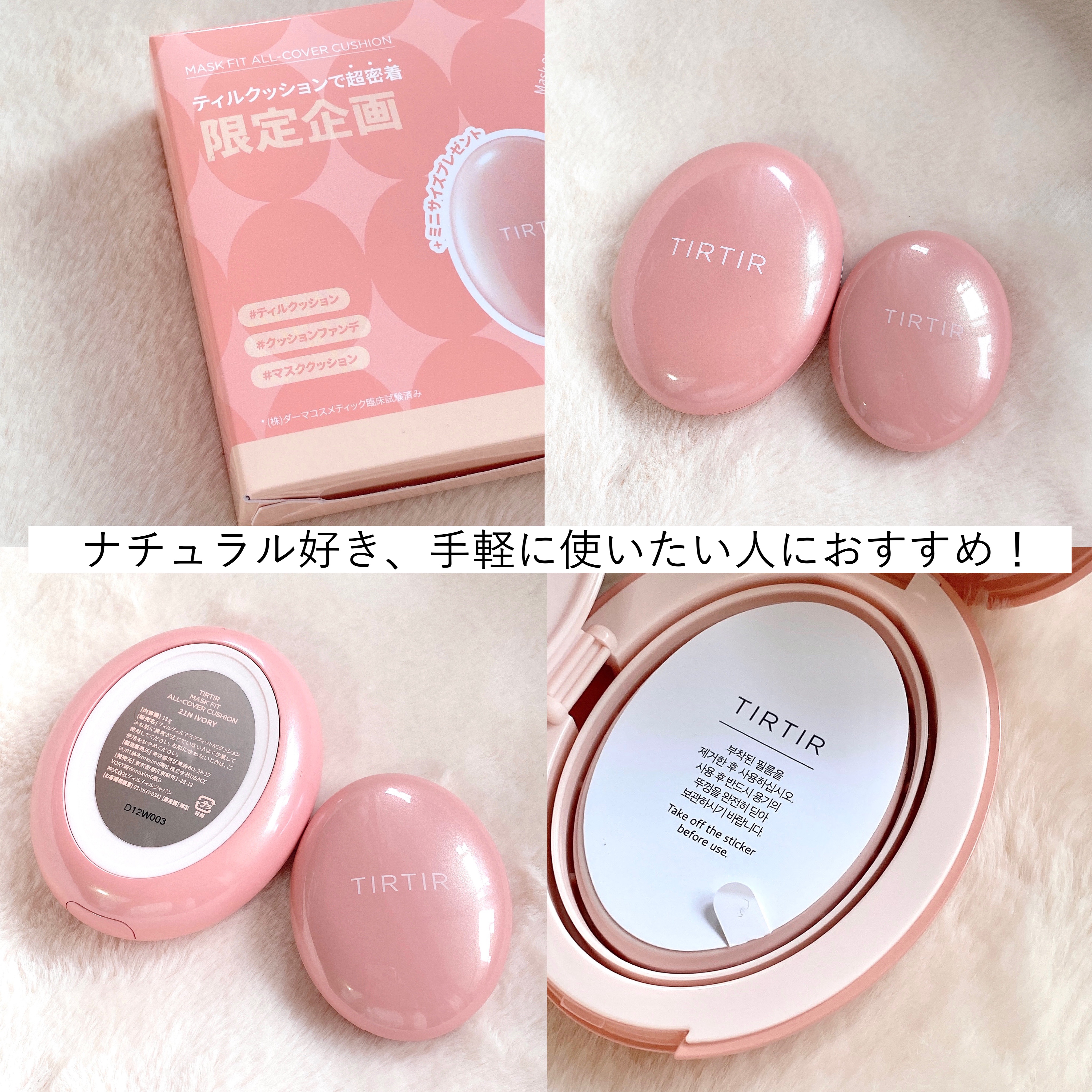 脂性肌の方におすすめ。 長時間メイクキープ。高いカバー力とさらっとした仕上がりが欲しい方へ! TIRTIRのクッションの中ではこのピンクのタイプはマットみたいですが少しツヤ感もあるように思いました✨ 日焼け止めとこのクッションのみでしたが崩れもほとんどなかった👍✨