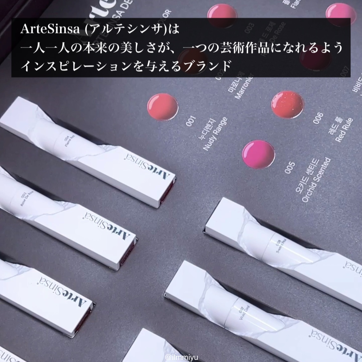 - 【Dewy Fit Tint 】は「彫刻ティント」で話題となったArteSinsanのシグネチャーティント 001/005カラーはリニューアルカラーで登場! 水分たっぷりのしっとりしたテクスチャーにウォータリーコーティングで鮮やかな発色に立体感を与えてくれます。 長持ちする着色力と高い保湿力を兼ね備え、唇に優しい使い心地で使用でき密着力も◎! まるでアーティスティック彫刻のようなティントです。