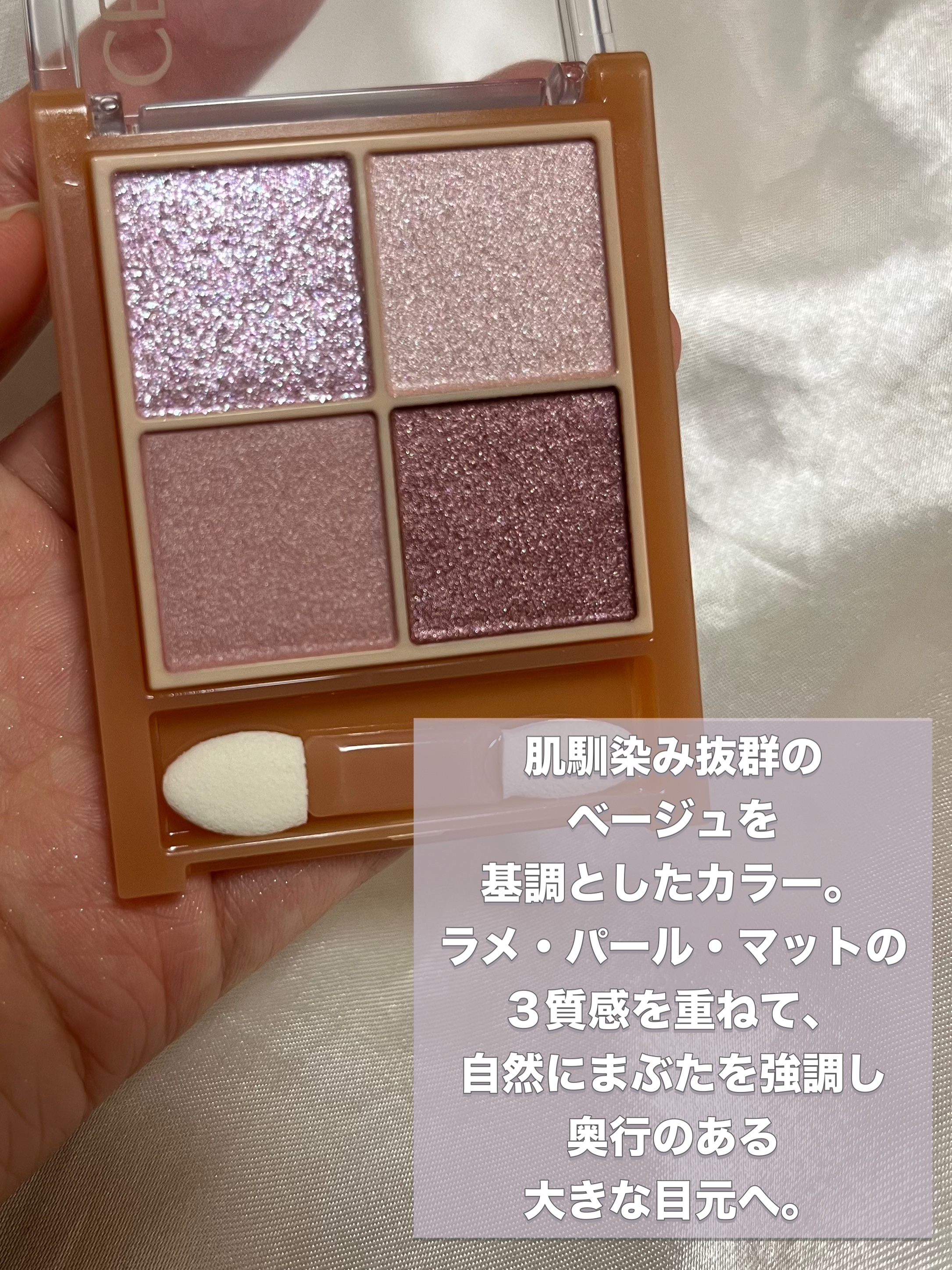 - ラメ・パール・マット3質感の4色アイシャドウ。 肌馴染みの良いベージュを基調としたカラー。ラメ・パール・マットの3質感を重ねて、自然にまぶたを強調し奥行のある大きな目元へ。 しっとり溶け込むような柔らかなパウダーなので、スルスル伸びてまぶたにピタッと密着。保湿成分(スクワラン・ホホバ種子油)配合。