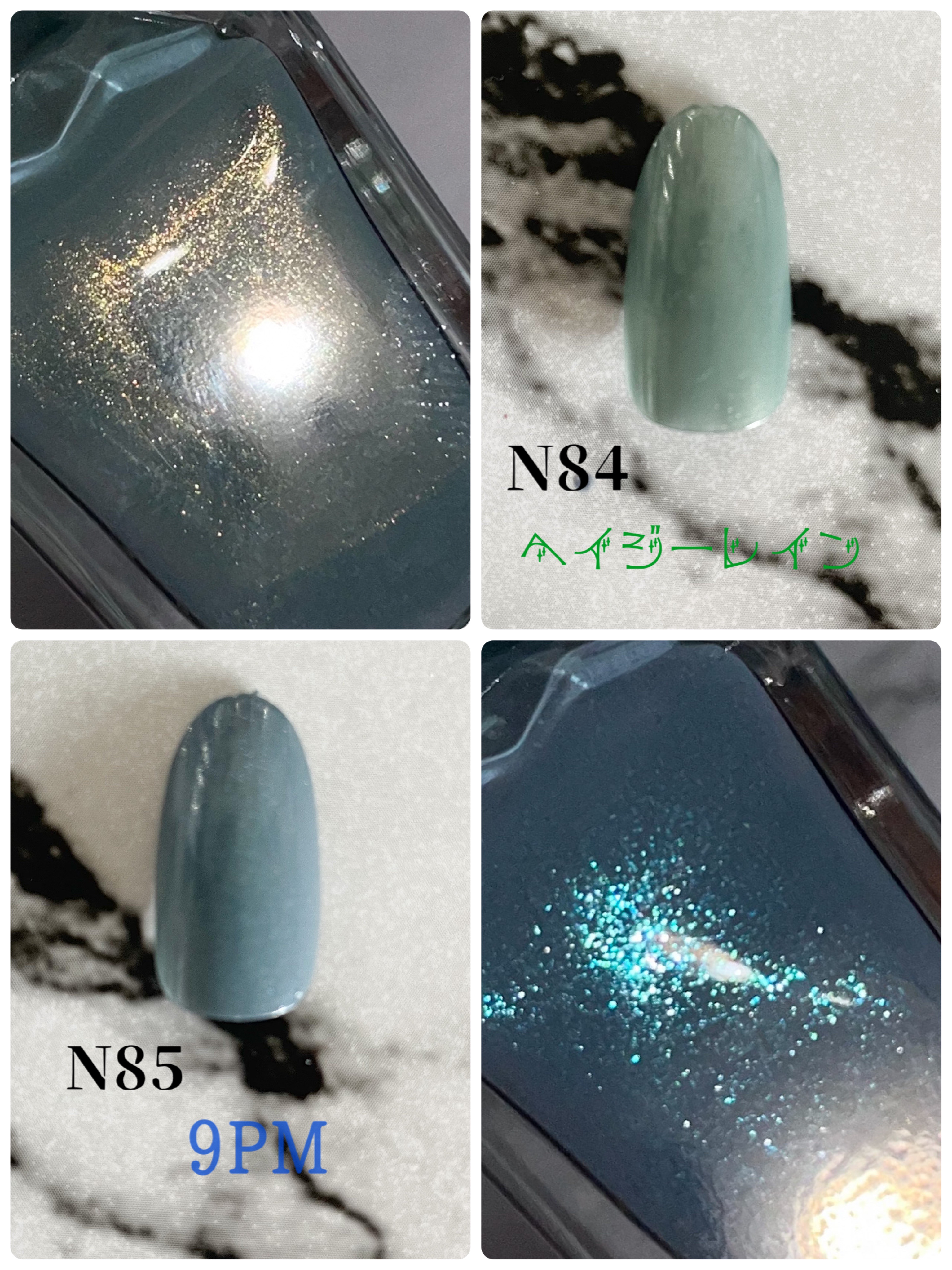 N82:クラウドレススカイ(新色) 青のパールがチラチラと輝いていてとても綺麗です‼︎ N83:ムーンレイ(限定色) 緑や青のラメも入っていて可愛いです。 N84ヘイジーレイン(限定色) ゴールドパールがとにかく綺麗‼︎超可愛いです❤️ N85:9PM(限定色) 青や緑に輝く偏光パールがとても綺麗です‼︎ N83.84.85は限定色なので皆さん売り切れ前に是非ゲットしてくださいね!!
