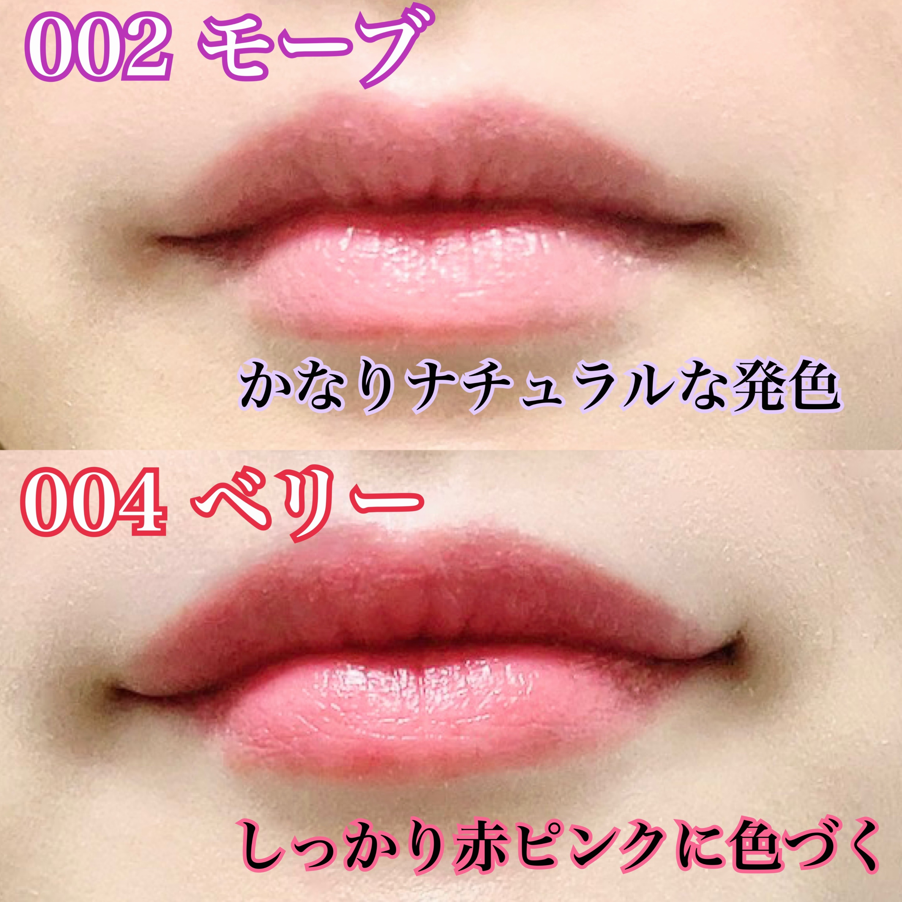 - <クリア> ヒマワリ種子油、オクチルドデカノール、トリイソステアリン酸ポリグリセリル-2、エチルヘキサン酸セチル、シア脂、ダイマージリノール酸(フィトステリル/イソステアリル/セチル/ステアリル/ ベヘニル)、合成 ワックス、(イソステアリン酸ポリグリセリル-2/ダイマージリノール酸)コポリマー、マイクロクリスタリンワックス、リンゴ酸ジイソステアリル、ヒマシ油、セレシン、キャンデリラロウ、マカデミアナッツ油ポリグリセリル-6エステルズベヘネート、オリーブ油脂肪酸ソルビタン、アーモンド油、セスキオレイン酸ソルビタン(小麦由来)、酢酸トコフェロール、ポ リリシノレイン酸ポリグリセリル-6、オレンジ油、デヒドロ酢酸、マンダリンオレンジ果皮油、アオモジ果実油、水、メドウフォーム油、トコフェロール、加水分解ヒアルロン酸、BG、1,2-ヘキ サンジオール、グリセリン、アボカ ドエキス、ケール葉エキス <モーヴ> ヒマワリ種子油、オクチルドデカノール、エチルヘキサン酸セチル、リンゴ酸ジイソステアリル、シア脂、トリイソステアリン酸ポリグリセリル-2、ダイマージリノール酸(フィトステリル/イソステアリル/セチル/ステアリル/ベヘニル)、合成ワックス、(イソステアリン酸ポリグリセリル-2/ダイマージリノール酸)コポリマー、マイクロクリスタリンワックス、ヒマシ油、セレシン、キャンデリラロウ、マカデミアナッツ油ポリグリセリル- 6エステルズベヘネート、オリーブ油脂肪酸ソルビタン、アーモンド油、酸化チタン、セスキオレイン酸ソルビタン(小麦由来)、酢酸トコフェロール、ポリ リシノレイン酸ポリグリセリル-6、オ レンジ油、硫酸Ba、デヒドロ酢酸、マ ンダリンオレンジ果皮油、ロジン、アオ モジ果実油、メドウフォーム油、トコ フェロール、加水分解ヒアルロン酸、ニンファエアコエルレア花水、水、B G、1,2-ヘキサンジオール、ヨー ロッパキイチゴ果実エキス、ローブッ シュブルーベリー果実エキス、マグワ 根皮エキス、エゾヘビイチゴ果実エキ ス、酸化鉄、赤202、青1、赤201 <ロージー> ヒマワリ種子油、オクチルドデカノール、エチルヘキサン酸セチル、トリイソステアリン酸ポリグリセリル-2、シア脂、ダイマージリノール酸(フィトステリル/イソステアリル/セチル/ステアリル/ベヘニル)、リンゴ酸ジイソステアリル、合成ワックス、(イソステアリン酸ポリグリセリル-2/ダイマージリノール酸)コポリマー、マ イクロクリスタリンワックス、ヒマシ油、セレシン、キャンデリラロウ、マカデミアナッツ油ポリグリセリル- 6エステルズベヘネート、オリーブ油脂肪酸ソルビタン、アーモンド油、酸化チタン、セスキオレイン酸ソルビタン(小麦由来)、酢酸トコフェロール、ポリリシノレイン酸ポリグリセリル-6、オレンジ油、硫酸Ba、デヒドロ酢酸、マンダリン オレンジ果皮油、アオモジ果実油、ロジン、水、メドウフォーム油、トコフェロール、加水分解ヒアルロン酸、BG、アンズ果実エキス、1,2-ヘキサンジオール、カニナバラ果実エキス、カプリリルグリコール、酸化鉄、赤201、赤202 <ベリー> ヒマワリ種子油、オクチルドデカノール、エチルヘキサン酸セチル、トリイソステアリン酸ポリグリセリル-2、シア脂、リンゴ酸ジイソステアリル、ダイマージリノール酸(フィトステリル/イソステアリル/セチル/ステアリル/ベヘニル)、合成ワックス、(イソステアリン酸ポリグリセリル-2/ダイマージリノール酸)コポリマー、マイクロクリスタリンワックス、ヒマシ油、セレシン、キャンデリラロウ、マカデミアナッツ油ポリグリセリル-6エステルズベヘネート、オリーブ油脂肪酸ソルビタン、アーモンド油、セスキオレイン酸ソルビタン(小麦由来)、酢酸トコフェロール、ポ リリシノレイン酸ポリグリセリル-6、硫酸Ba、オレンジ油、デヒドロ酢酸、マンダリンオレンジ果皮油、ロジン、アオモジ果実油、水、メドウフォーム油、トコフェロール、加水分解ヒアル ロン酸、BG、クランベリー果実エキス、1,2-ヘキサンジオール、ヨー ロッパキイチゴ果実エキス、ローブッシュブルーベリー果実エキス、マグワ根皮エキス、エゾヘビイチゴ果実エキス、酸化鉄、赤202、赤201