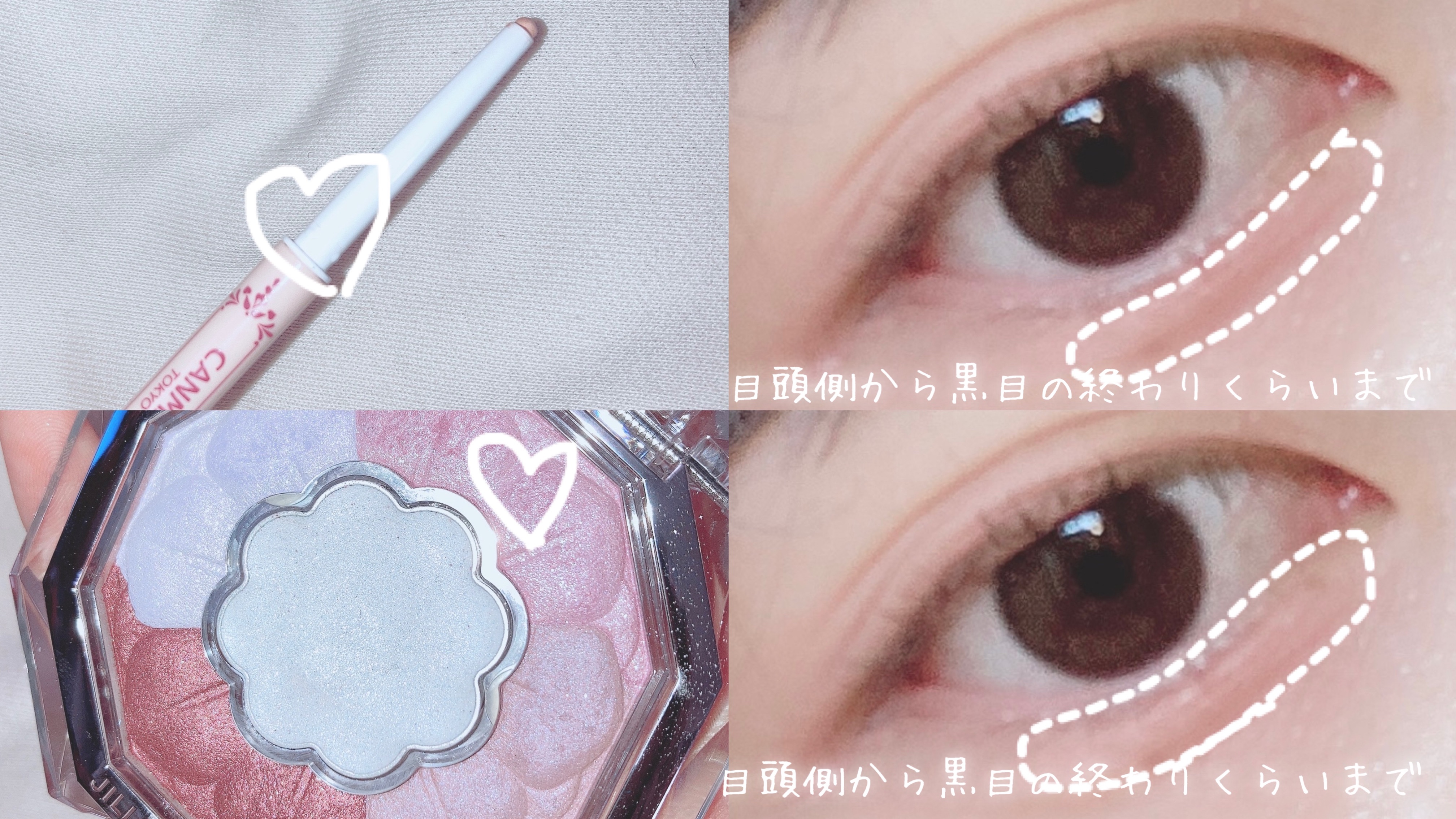 アイシャドウ👀・CLIOプロ アイ パレット01SIMPLY PINK グリッター✨・PERIPERAデュオ ポケット グリッター シャドウ03SALTED SUGARPLUM 涙袋のコンシーラー👧・キャンメイクカラーミキシングコンシーラーオレンジベージュ マスカラ💇♀️・rom&ndハンオールフィックスマスカラL02LONG ASH アイライン✏️・キャンメイククリーミータッチライナーダークブラウン・CEZANNE極細アイライナーEX20ブラウン