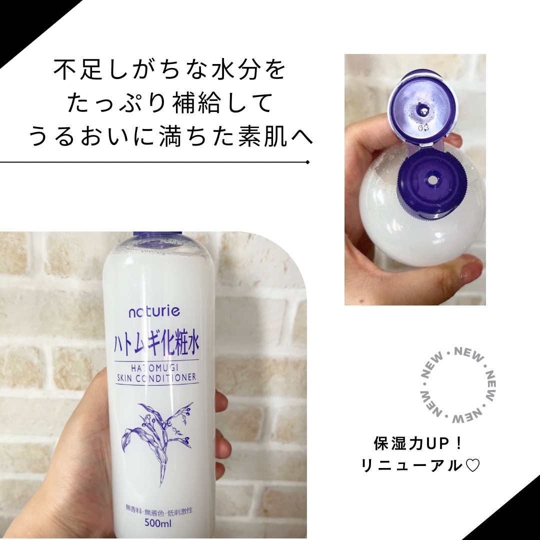 - 肌にうるおいを与えてスキンコンディションを整える、天然保湿成分ハトムギエキス配合の化粧水です。 みずみずしく浸透力に優れた処方なので、重ねるほどぐんぐん肌になじみ、角質層を水分で満たします。 たっぷり肌に重ねづけしてもべたつかないさっぱりした使用感なので、スキンケアのはじめにたっぷり使ってください。 肌がひんやりしてきたら十分に水分がなじんだサインです。 ■基本は化粧水として スキンケアのはじめにたっぷり使ってください。 500円玉大の量を3回重ねづけするのが目安です。 肌がひんやりしてきたら十分に水分がなじんだサインです。 ■ローションパックでさらにうるおい コットンやフェイスマスクにたっぷり含ませて約3分間パックすると、角質水分量がさらに高まります。 ■プレ化粧水として 洗顔後すぐにつけることで、その後につけるスキンケアのなじみをよくします。※角質層まで ■ボディにも べたつかないので、毎日の入浴後や日差しを浴びた後などのボディのスキンケアにもおすすめです。