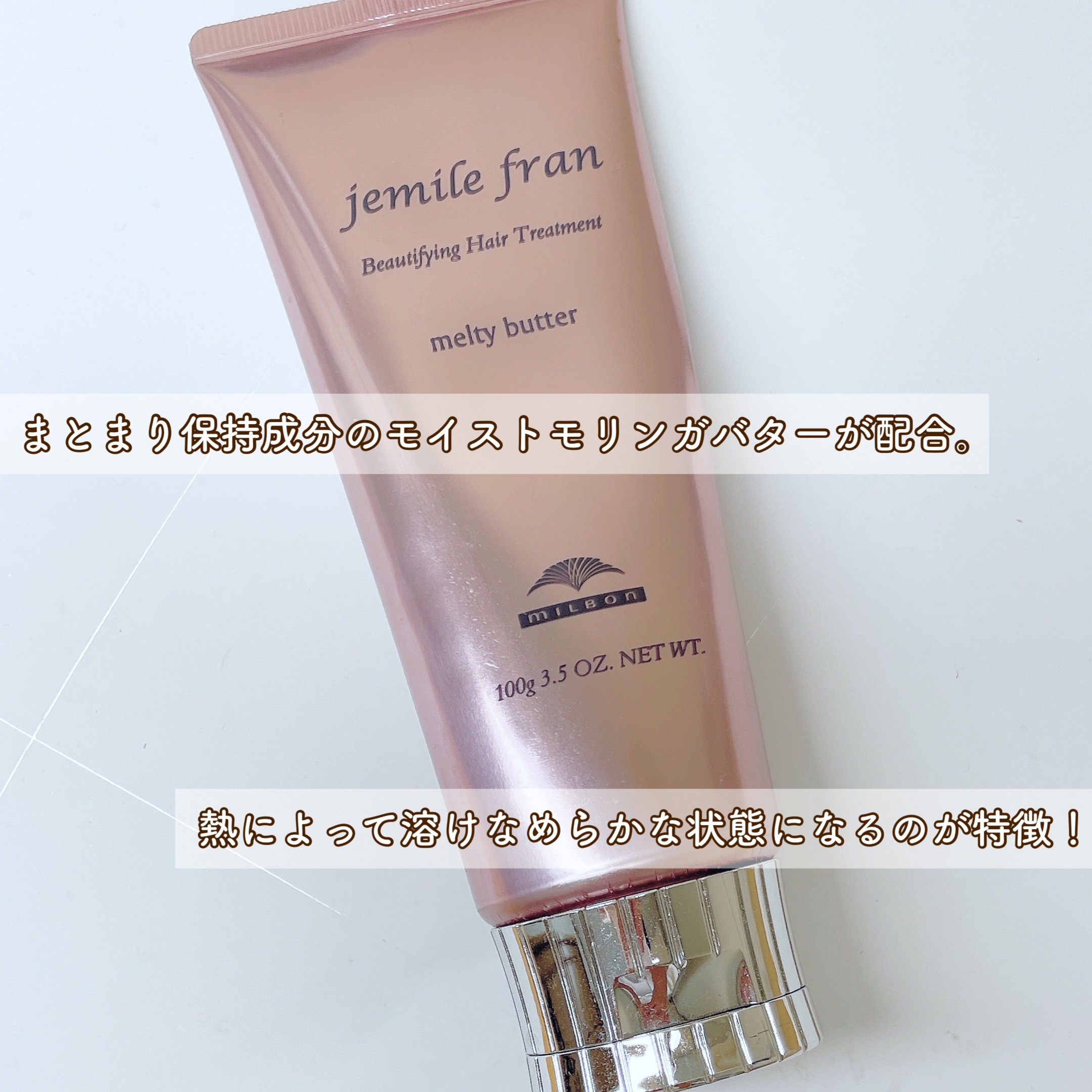 固めのバームだけど、手に馴染ませると体温で溶けてなめらかになって、髪に馴染みやすくなった!! しっとりしていて、次の日寝癖とか気にならなくなったので、朝のセットが楽になりました✨ まとまりを記憶するモイストモリンガバター配合(モイストモリンガバター▶▷▶ ①ドライヤーを当てると、熱によって溶けなめらかな状態になります。)
