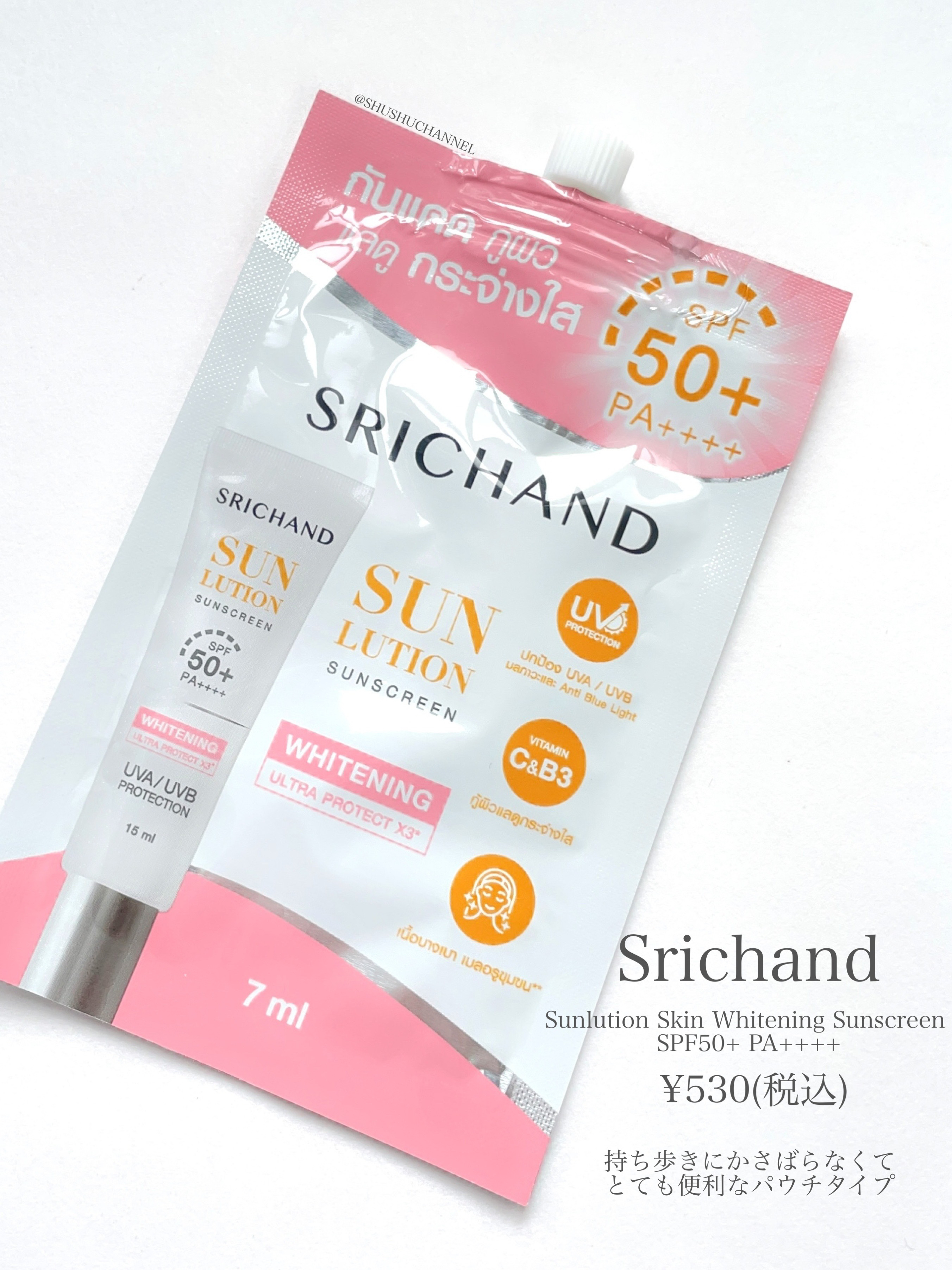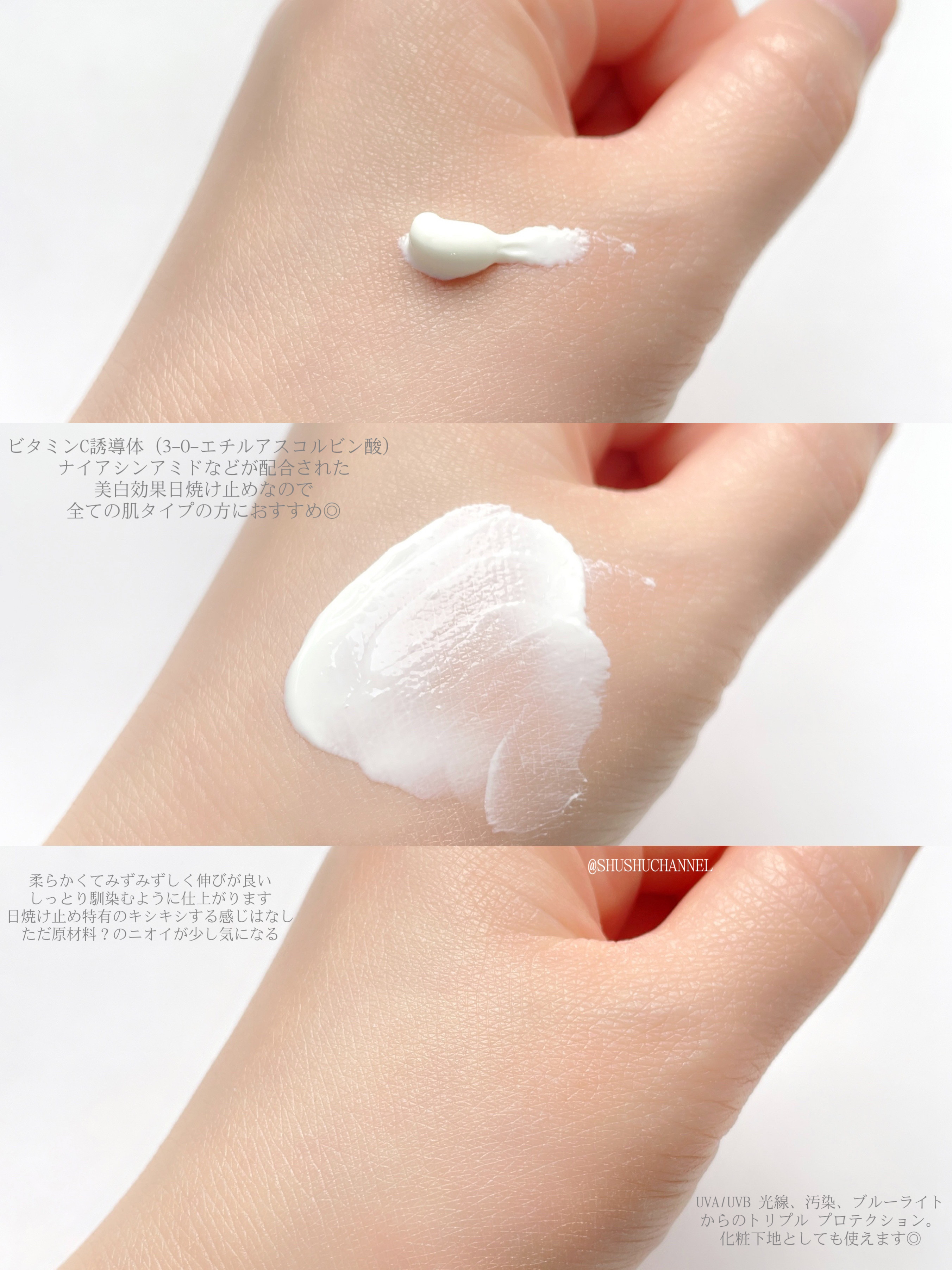 化粧下地にも使える日焼け止め☺️ 白浮きせずにお肌に自然なツヤ感が出ます✨ ビタミンC誘導体(3-0- エチルアスコルビン酸)ナイアシンアミドなどが配合された美白効果も期待できる日本でもパウダーが人気のシーチャンの日焼け止めです。 UVA/UVB 光線、汚染、ブルーライトからのトリプル プロテクション。化粧下地としてもつかえます。