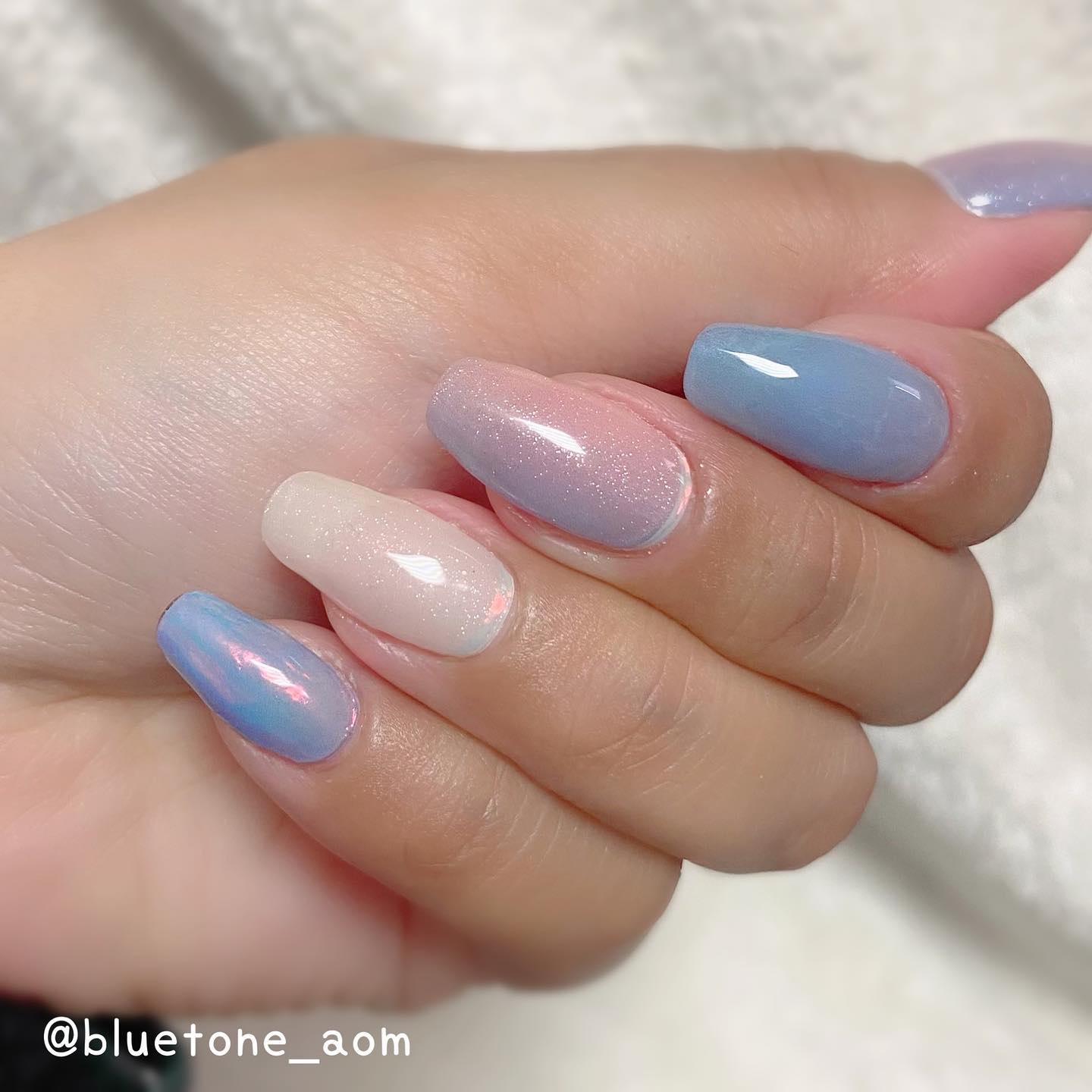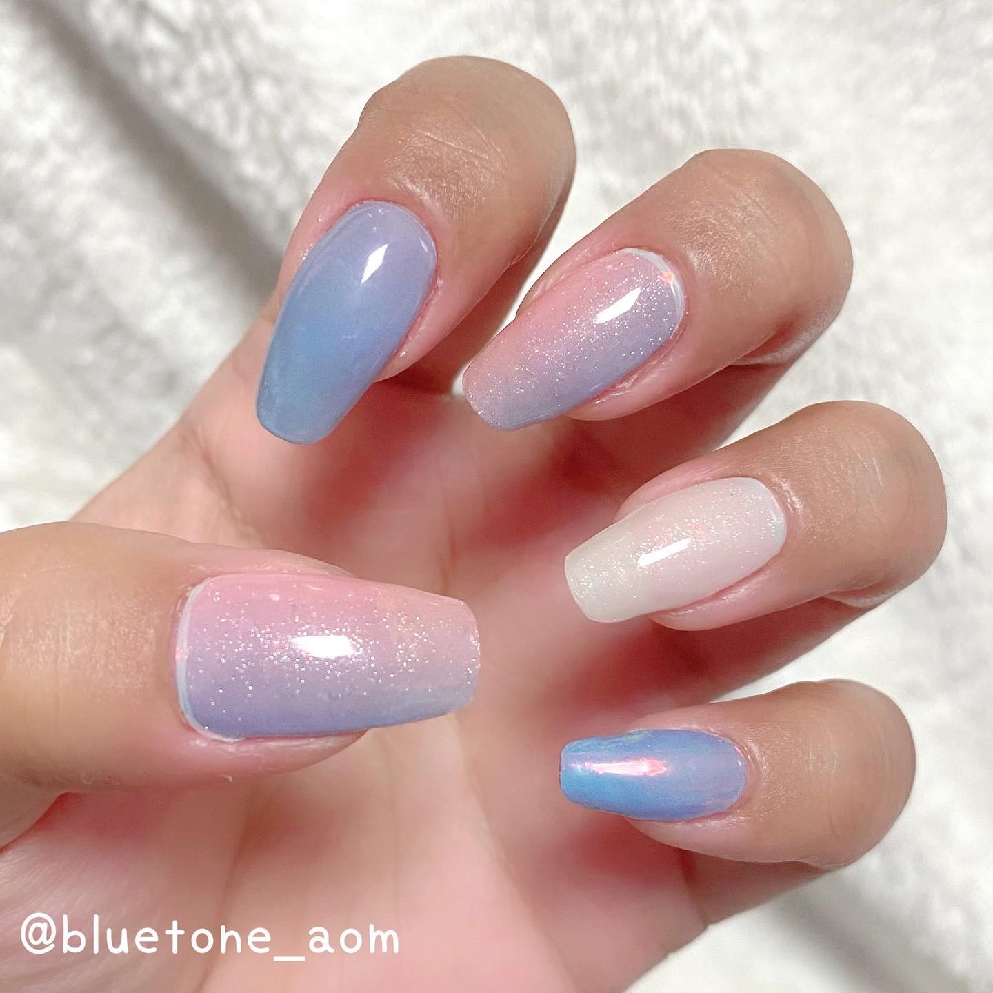 ラメがしっかりしてるし クリアカラーが入ってるから オーロラパウダー無しでも 充分キラキラしました! 反射強めのフィルムなので 実物はもっと うるうるとキラキラが強いです! ビー玉みたい🥺 ネイルシール長持ちさせたいけど ちょっと飽きてきたな〜って時とかに 全然違った印象になるのでオススメです! Seriaのベースジェル 本当にうるうるネイルしやすいので オススメしたい🙆♀️