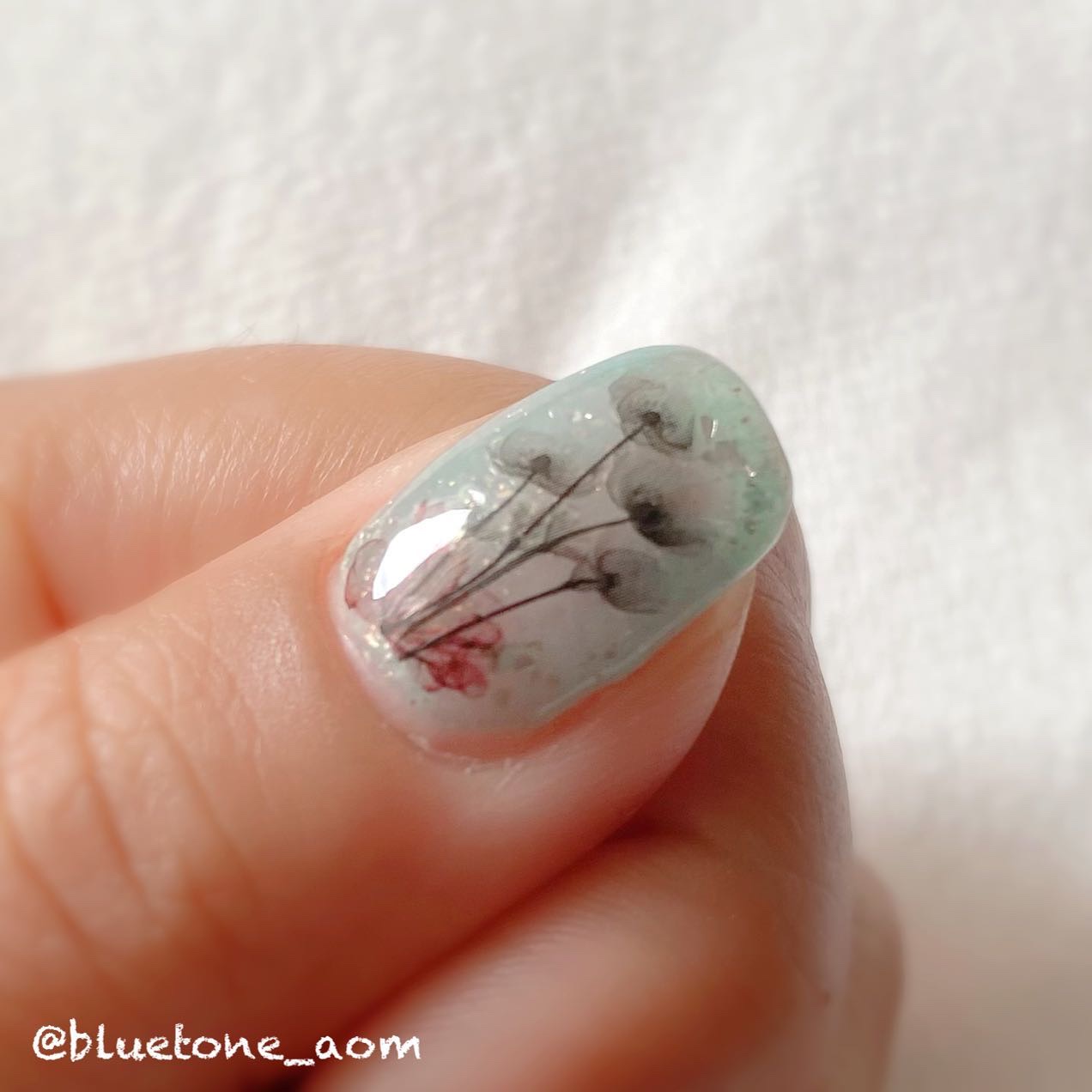 ラメがしっかりしてるし クリアカラーが入ってるから オーロラパウダー無しでも 充分キラキラしました! 反射強めのフィルムなので 実物はもっと うるうるとキラキラが強いです! ビー玉みたい🥺 ネイルシール長持ちさせたいけど ちょっと飽きてきたな〜って時とかに 全然違った印象になるのでオススメです! Seriaのベースジェル 本当にうるうるネイルしやすいので オススメしたい🙆♀️