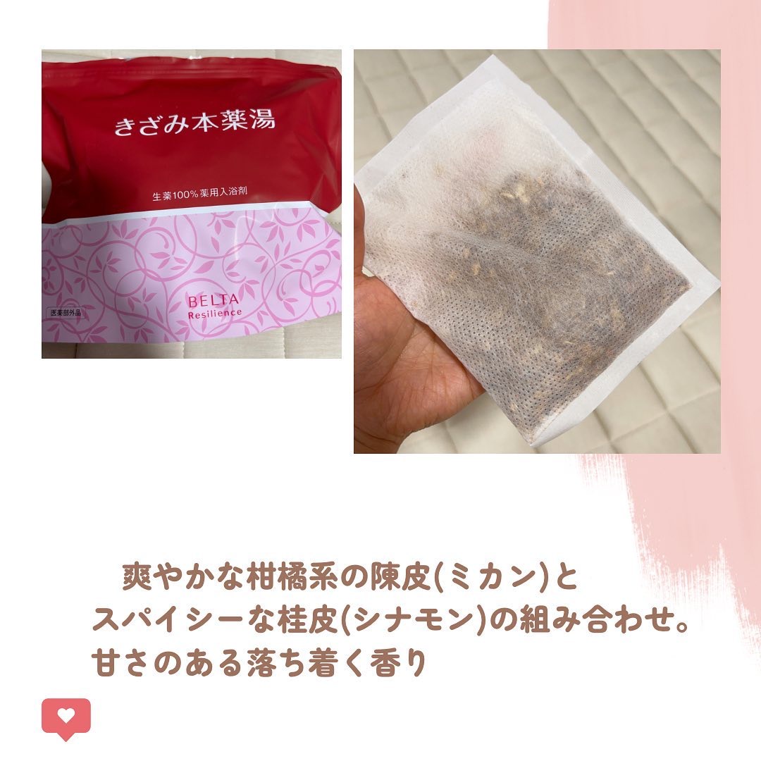 薬湯を作り続けて40年余りの製薬会社が監修。薬草処方師により厳選された7つの生薬を配合。 風呂上がりもポカポカして温かく感じます☺️ 夜のランニングが日課になっている自分にとって、疲れた後のきざみ本薬湯での入浴は最高です✨ 漢方薬みたい匂いもあって疲れも体の痛みも普段より回復できている感じがします👍