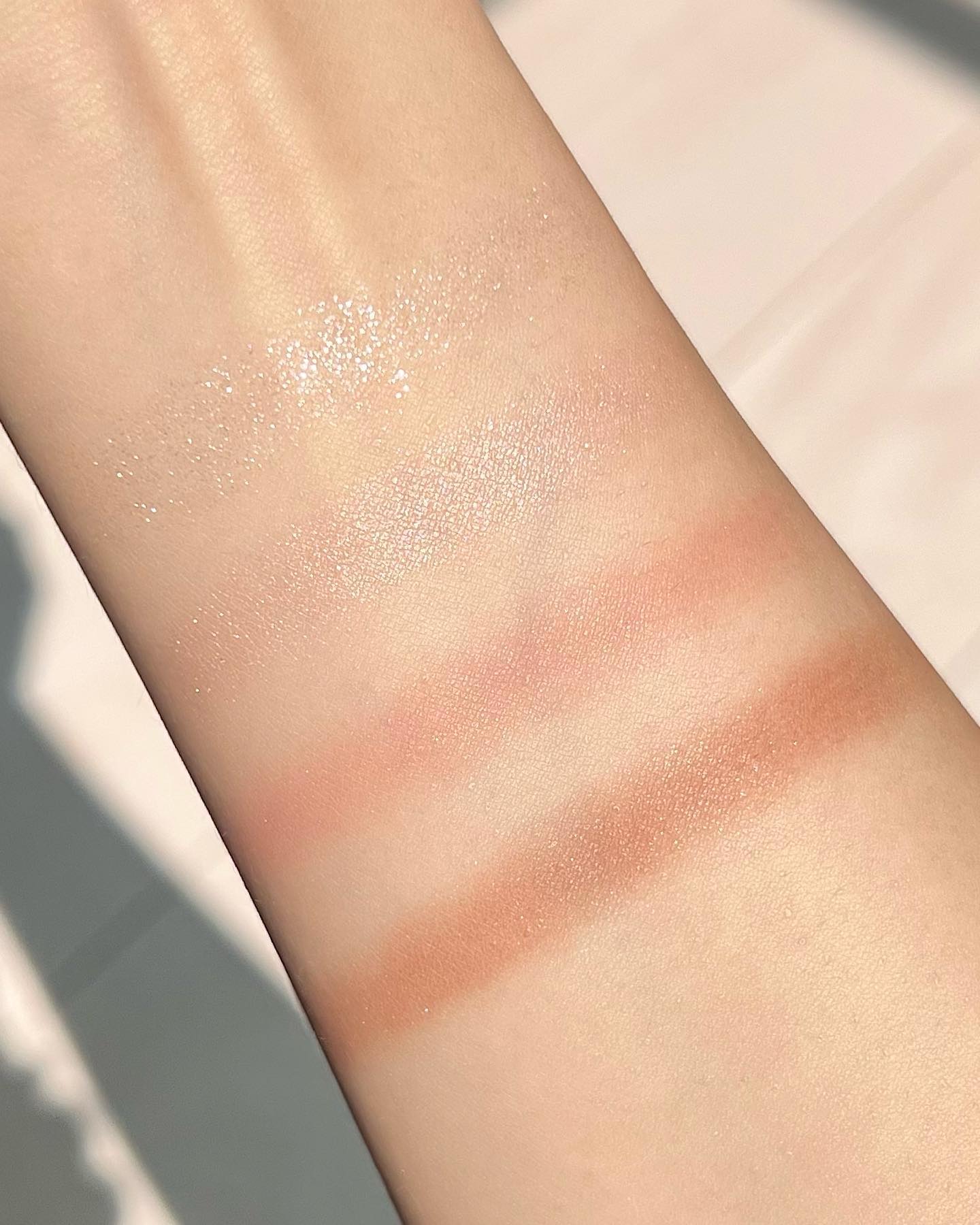 右上のピンクラメをベースに仕込んでメイクしたんだけどツヤと煌めき感えぐすぎる😳💎可愛い、、 そこに右下のカラーを重ねるとじんわり血色感が滲み出るような目元になるよ🦩 これは欠品店舗続出しそう🫣
