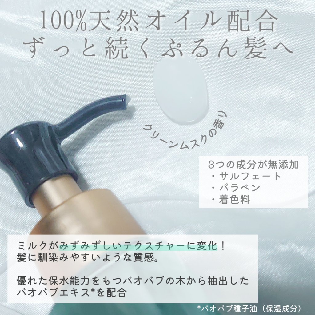 - ずっと続く、みずみずしい髪へ。 100%天然バオバブエキス*配合。 ミルクが手のひらで水のようなテクスチャーに変化。 厳選保水処方でうるおいに満たされる。 クリーンムスクのみずみずしい香り。 *バオバブ種子油(保湿成分)