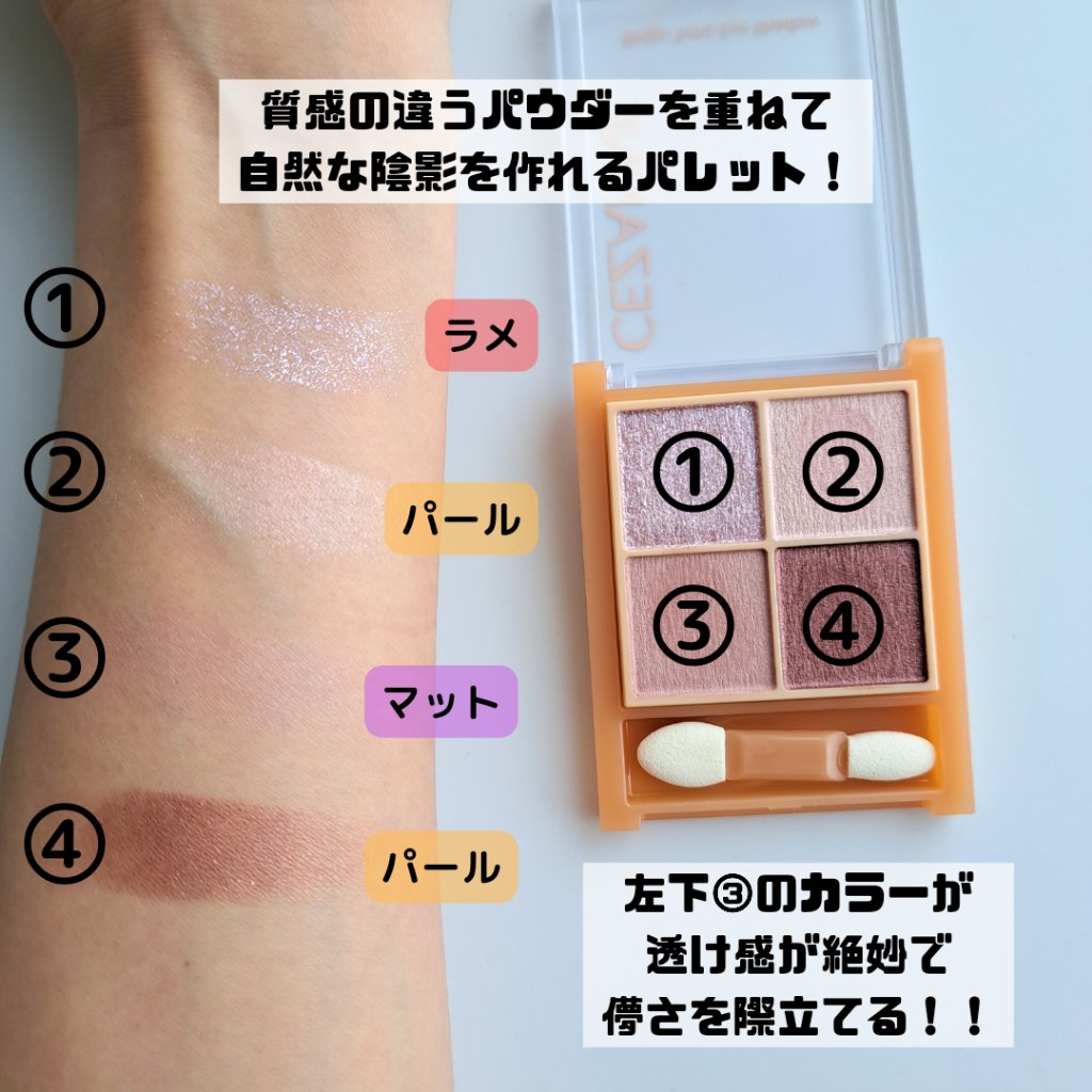 - ラメ・パール・マット3質感の4色アイシャドウ。 肌馴染みの良いベージュを基調としたカラー。ラメ・パール・マットの3質感を重ねて、自然にまぶたを強調し奥行のある大きな目元へ。 しっとり溶け込むような柔らかなパウダーなので、スルスル伸びてまぶたにピタッと密着。保湿成分(スクワラン・ホホバ種子油)配合。