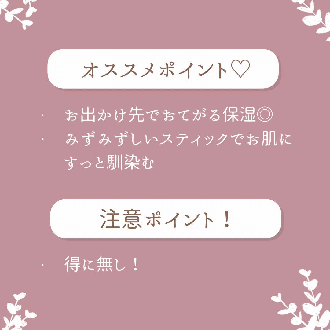 水分補給された感がすごい! 肌に水分が入った感覚が気持ちいい🍨 チークとか取れちゃうのでお直し必須 夏場は特にかなり重宝しそう🐟🤍 その後サッとメイク直しすると、 疲れた肌が元気にリセットされる感覚があります。 乾燥するオフィス飛行機とかでも良いかも!