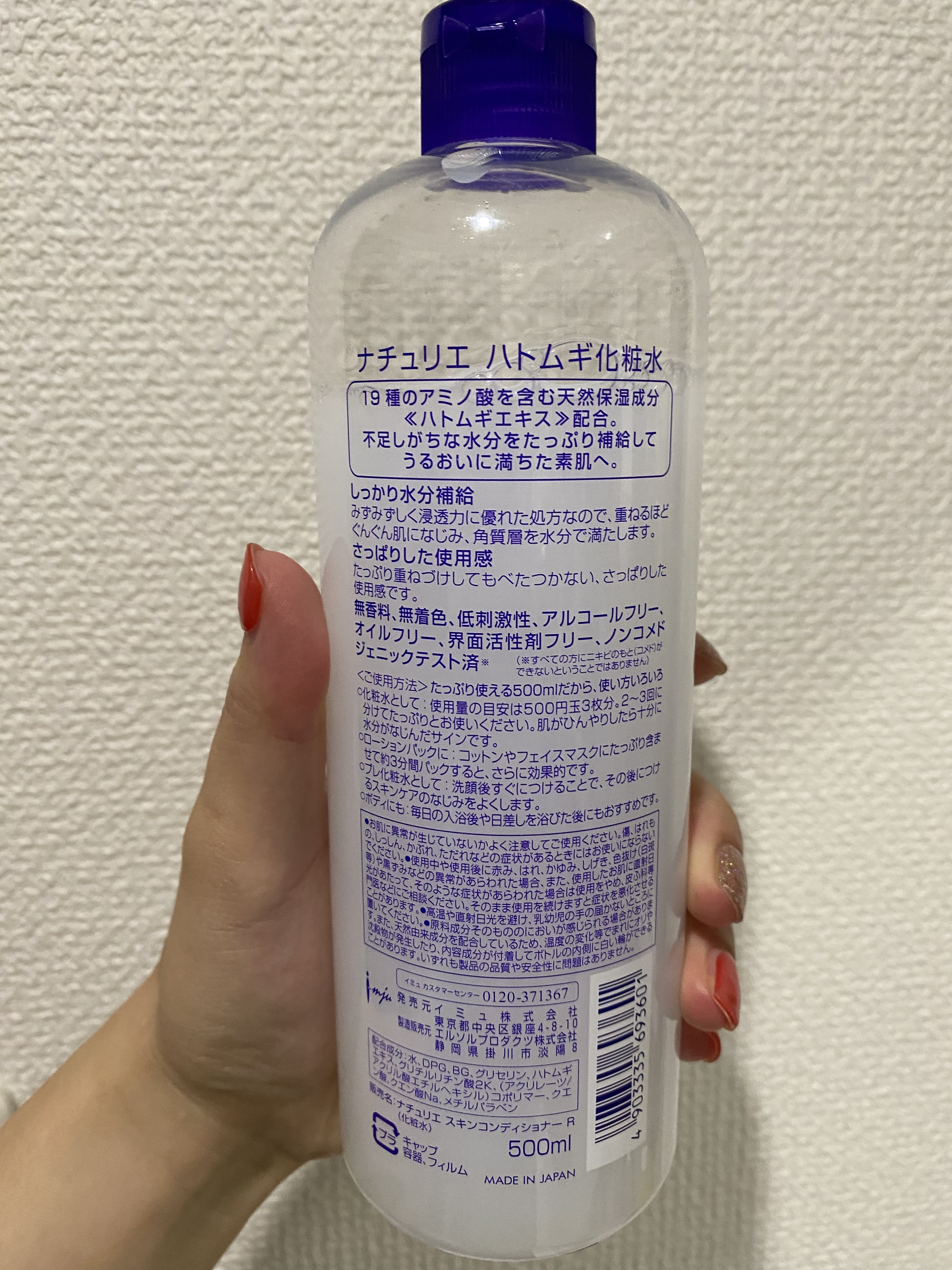 - <通常サイズ 500ml> 水、DPG、BG、グリセリン、ハトムギエキス、グリチルリチン酸2K、(スチレン/VP)コポリマー、クエン酸、クエン酸Na、メチルパラベン <500ml+ 限定ムーミンデザインボトル> 水、DPG、BG、グリセリン、ハトムギエキス、グリチルリチン酸2K、(スチレン/VP)コポリマー、クエン酸、クエン酸Na、メチルパラベン <詰め替えタイプ 480ml> 水、DPG、BG、グリセリン、ハトムギエキス、グリチルリチン酸2K、(スチレン/VP)コポリマー、クエン酸、クエン酸Na、メチルパラベン <旧製品> BG、グリセリン、メチルパラベン、エタノール、グリチルリチン酸2K、ハトムギエキス、DPG、クエン酸Na、プロピルパラベン、クエン酸、(スチレン/アクリレーツ)コポリマー、水 <限定ムーミンデザイン> 水、DPG、BG、グリセリン、ハトムギエキス、グリチルリチン酸2K、(スチレン/VP)コポリマー、クエン酸、クエン酸Na、メチルパラベン