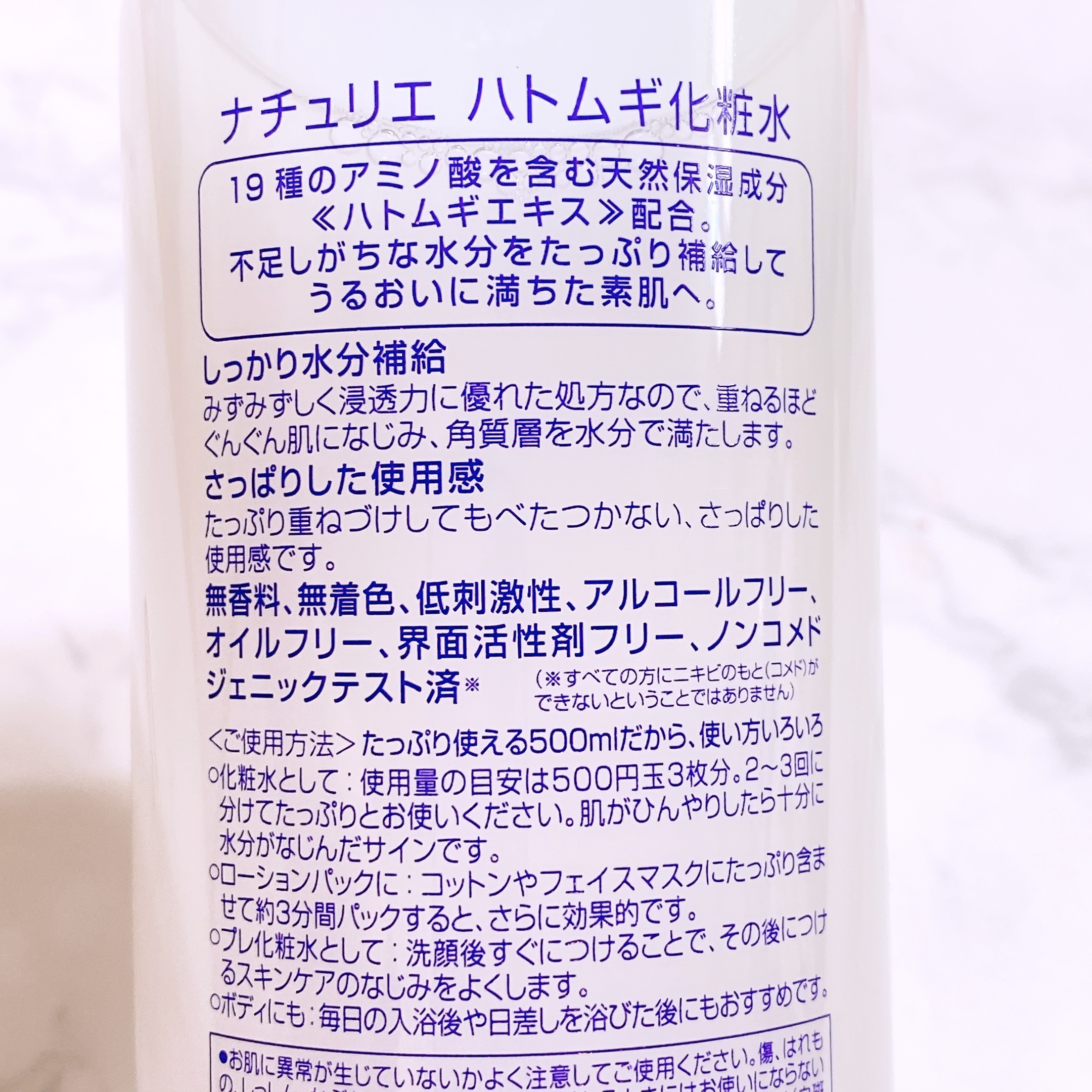 ハトムギエキス20%増量で保湿力UP →天然植物由来の保湿成分ハトムギエキスを従来品より20%増量 アルコールフリーに →毎日快適に使いやすいアルコールフリーになった テクスチャーはみずみずしくベタつかない 肌にスーッと馴染んでくれる
