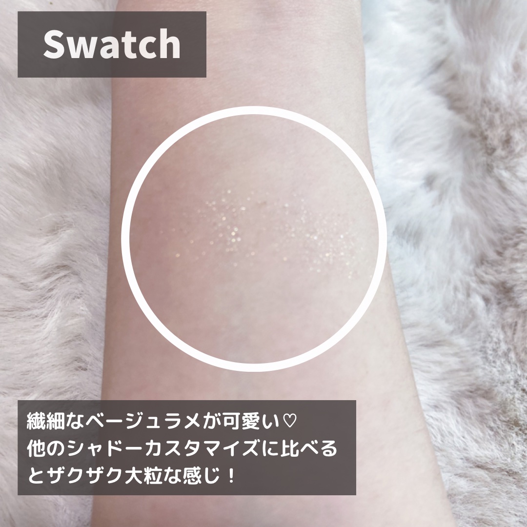 - 思いのままにカスタムできる 大粒ラメがきらめくアイシャドウ ○輝度の高い大粒ラメが密着しラメ落ちしないから、瞳全体輝きを増してより華やかな印象が続く -フローティングベース処方 ○ラメがチラチラ浮いているように輝き、華やかに、そして立体感のある目もとへ。 【色調】 〈フローティング:大粒ラメがチラチラ浮いているように見える仕上がり〉