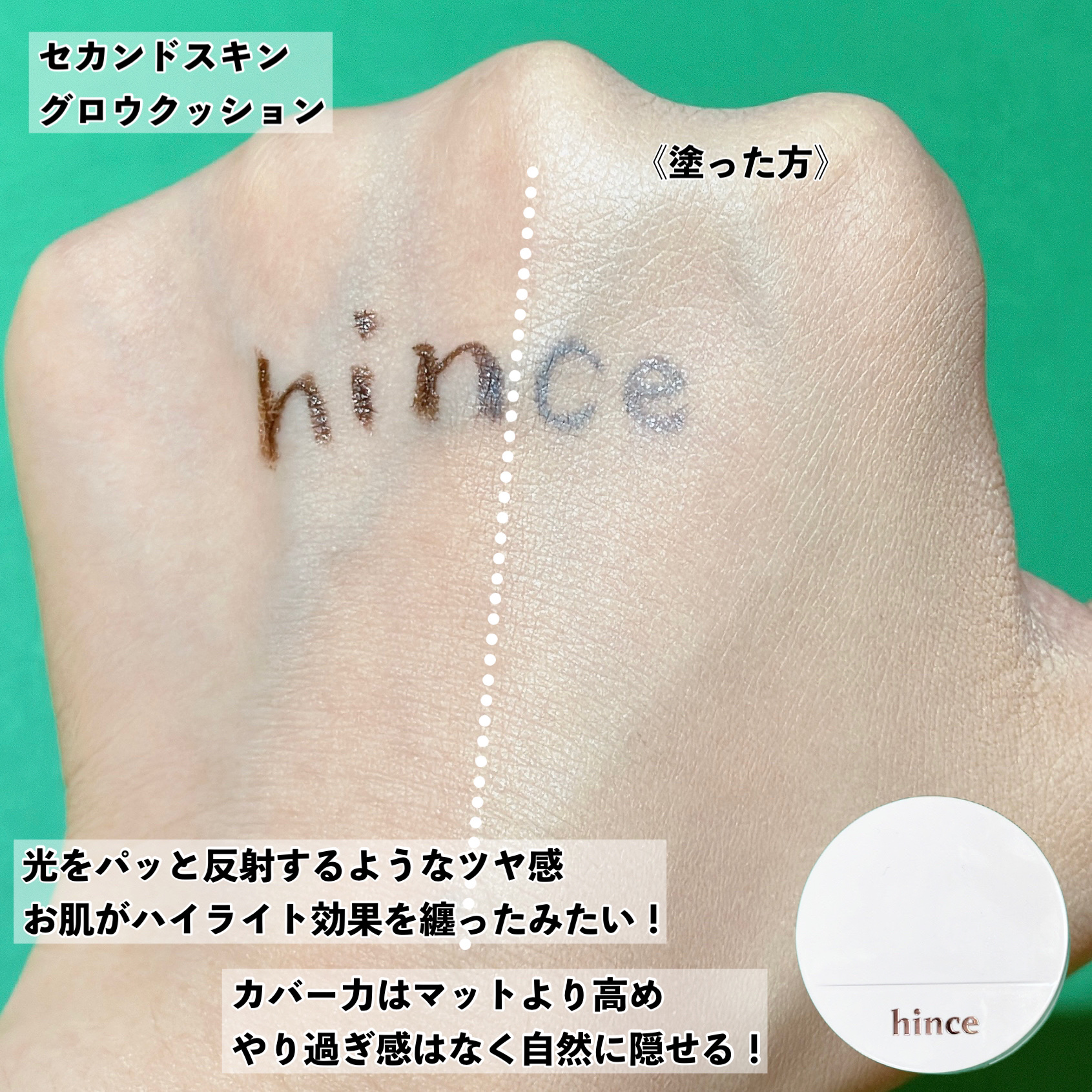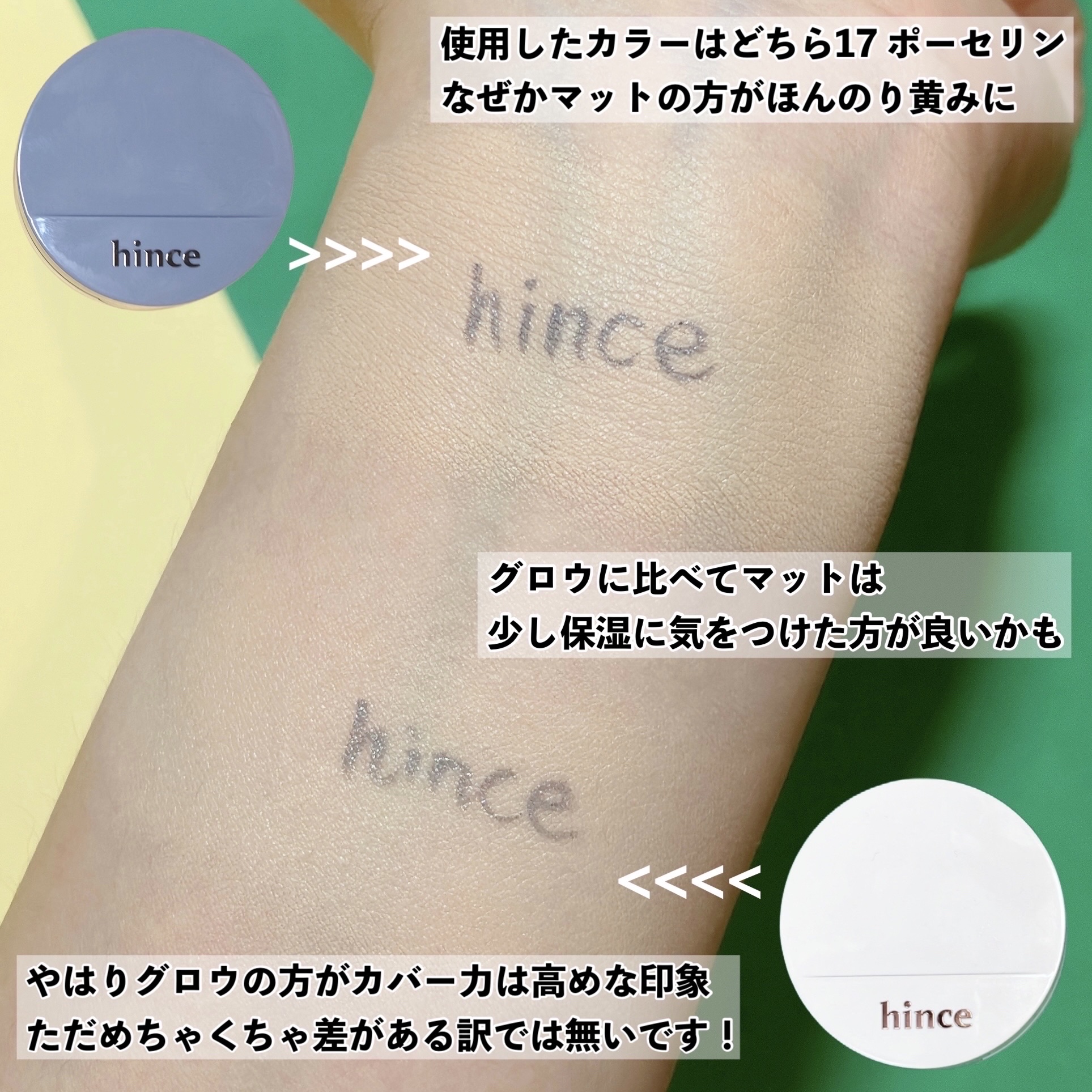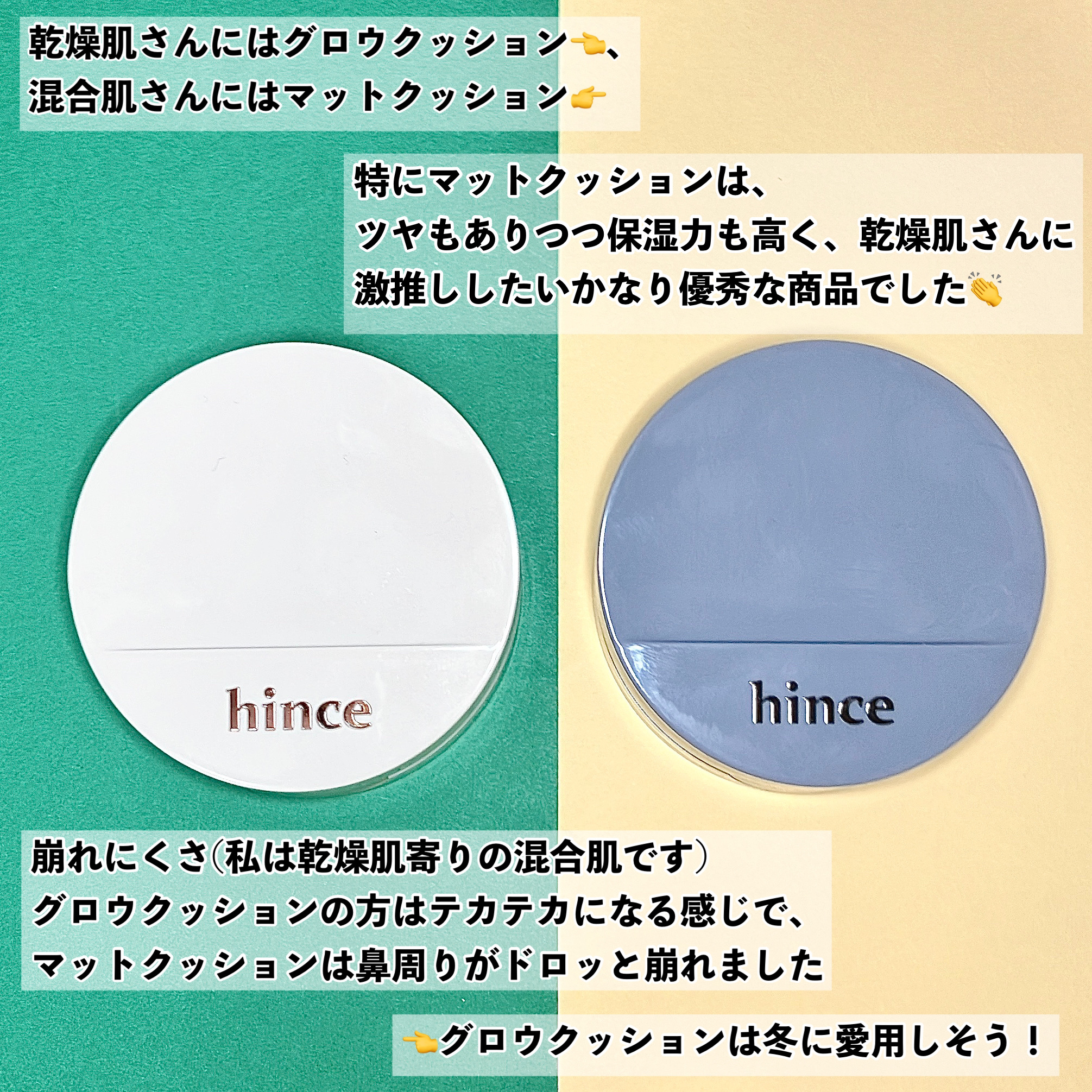 hinceから新発売されたセカンドスキンメッシュマットクッション、とっても気になっていたので、既存品と一緒に買ってみました😆 マットには珍しいメッシュタイプのクッション! 今までメッシュと言えばグロウという概念を覆した画期的な商品です!マット特有の重苦しさがない、とても軽い質感✨️ やはり艶感が本当に綺麗! お肌がハイライト効果を纏ったみたいな輝きで、好き…🥰 意外にもカバー力はマットより高めでした。 とはいえ、やり過ぎ感はなく自然に隠せるのでそこも高ポイント✨️ ただ、真夏に使うと汗や皮脂で多少は崩れました💦 顔全体がテカテカになる感じで、崩れ方自体は綺麗👍 エアコンの効いた乾燥する部屋などで活躍しそう 使ってみて、仕上がりは個人的にセカンドスキンメッシュマットクッションの方が好みでした。 ただ、真夏でも汗をたくさんかかない方、エアコンの効いた部屋に長時間いる方にはセカンドスキングロウクッションの方がおすすめです✨