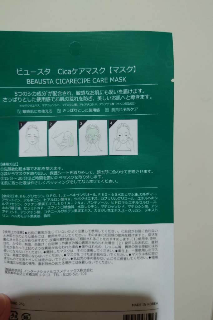 - <1枚> 水、BG、グリセリン、ヒアルロン酸Na、カルボマー、香料、ホホバ種子油、アルギニン、カプリリルグリコール、エチルヘキシルグリセリン、ツボクサエキス、DPG、カミツレ花エキス、水添レシチン、ヒドロキシエチルセルロース、セラミドNP、PEG-60水添ヒマシ油、ベルガモット果実油、デキストリン、パンテノール、1,2-ヘキサンジオール、アラントイン、EDTA-2Na、クチナシ果実エキス、マデカッソシド、スフィンゴ糖脂質、β-グルカン、アシアチコシド、マデカシン酸、アシアチン酸、コチニールサボテン果実エキス