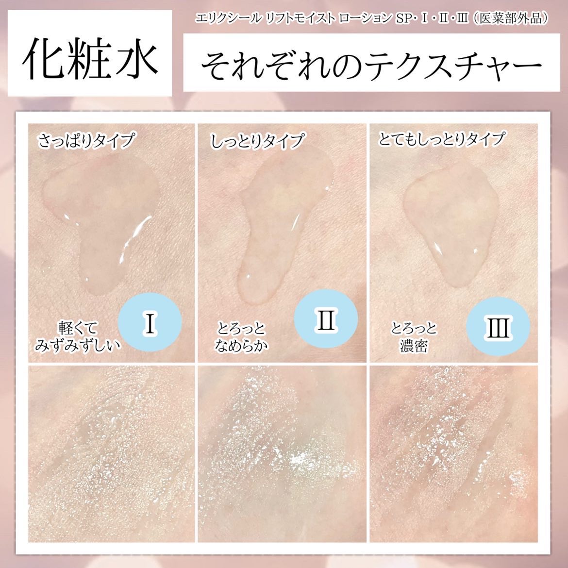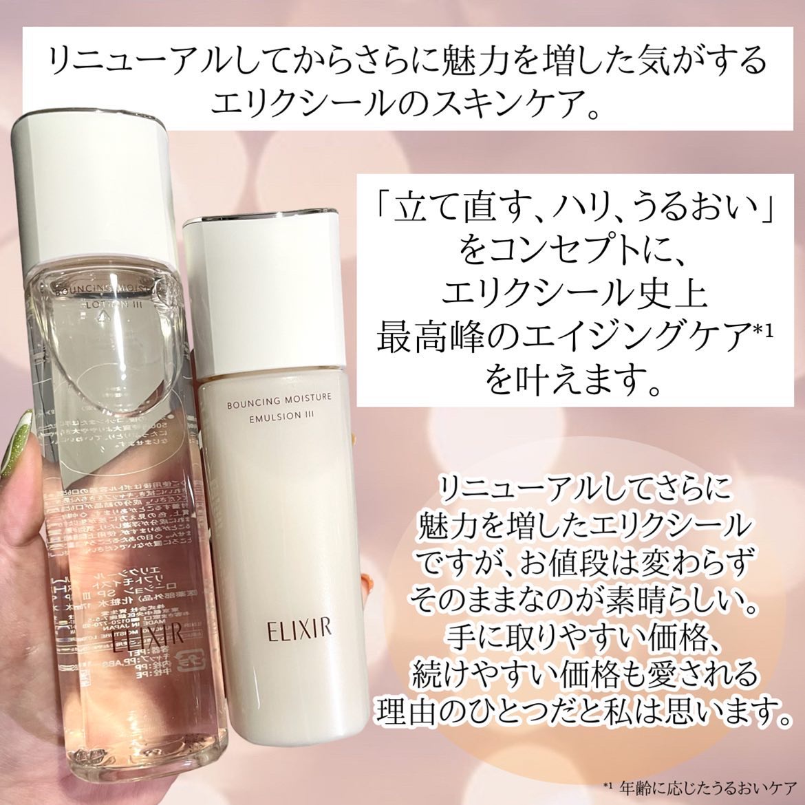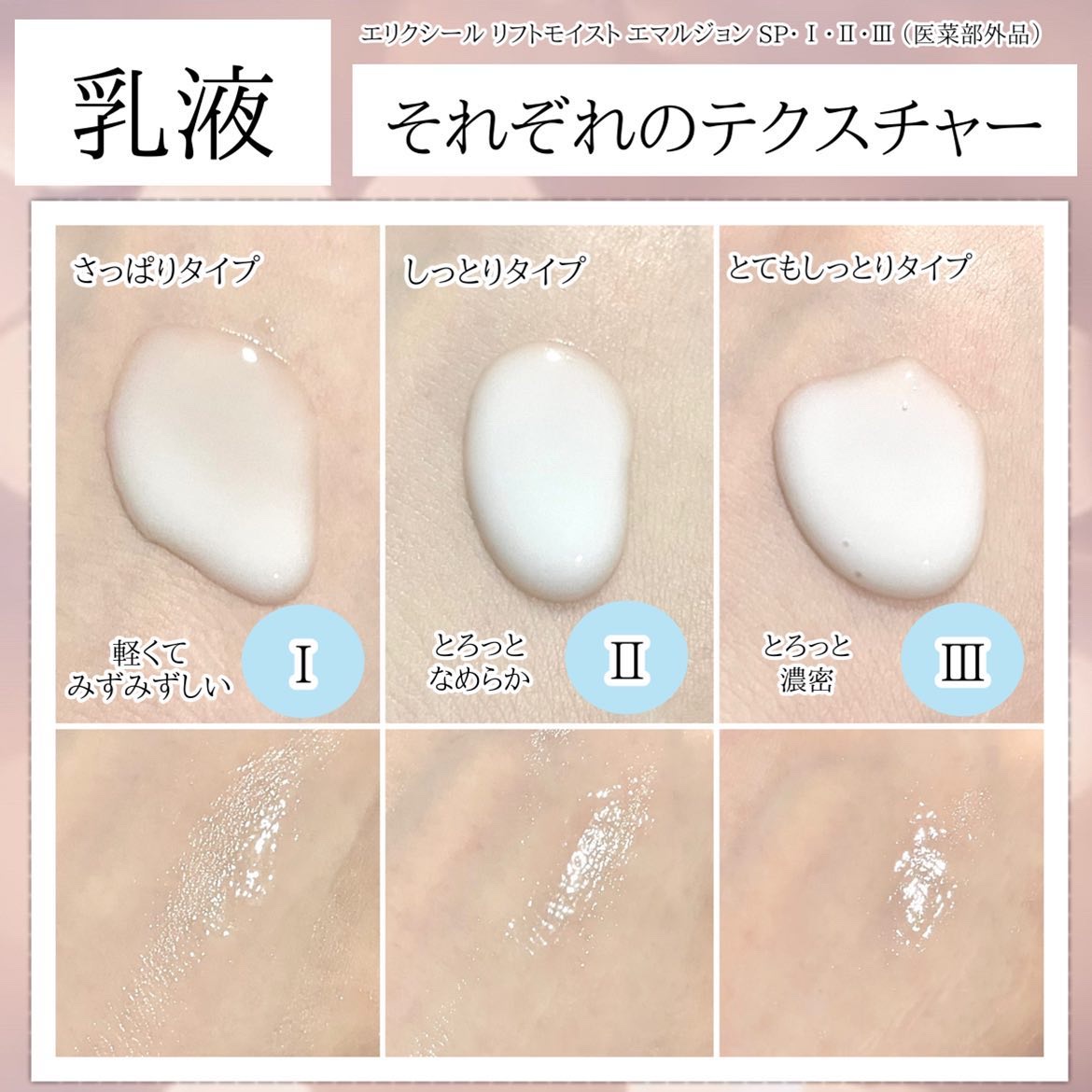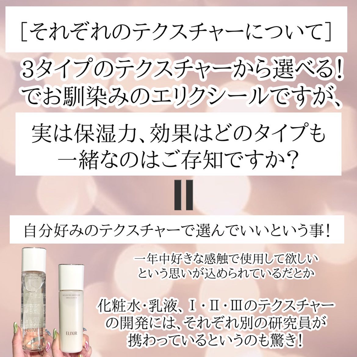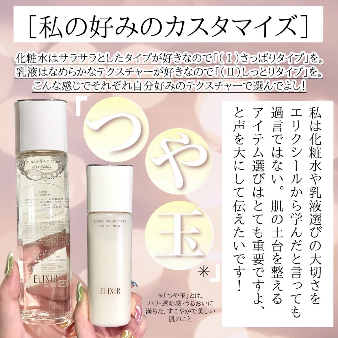 大好きなエリクシール。30代前半の時によく使用しておりました♡ ローションは、ややとろみ?のあるテクスチャで手のひらでもよし、コットンにたっぷり浸してやさしくなじませていきます。 エマルジョンは、乳白色したなめらかなテクスチャ。ローションのあとに使用してますが伸びてなしまやすい!