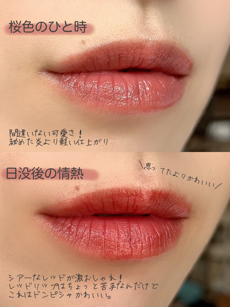発色はけっこうよくて一度塗りでもしっかり色づく。 色持ちはティントじゃないからそこまでよくはないかな。 ツヤ感、透明感ありでどんなメイクの時にも使いやすい。 唇の血色悪い人はこの透明感で思ってたより発色しないかもしれない。 唇の血色いい人はヴィセの方が合ってそう。