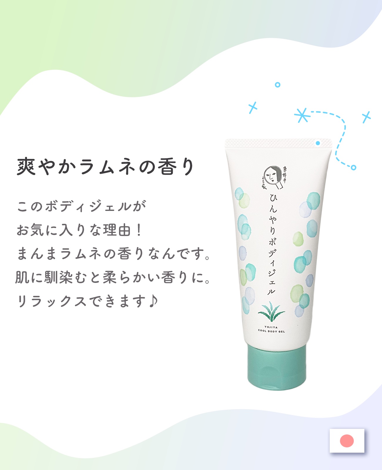 - 〈季節限定〉夏らしいラムネの香りの、クールダウン&保湿1本2役のボディジェル。冷感成分メントール・メントキシプロパンジオール配合で、暑い日の外出時や入浴後にほてった肌をクールダウン。常温はもちろん、冷蔵・冷凍して使用するとさらにひんやり感がアップ。 アロエベラ葉エキスやヒアルロン酸Na、スクワランなど6種類の保湿成分も配合し、おろそかになりがちな夏場の保湿も、クールダウンしながら心地よく楽しめます。美容液としてお使いいただくことができるのもうれしいポイント(目元は避けてご使用ください)。