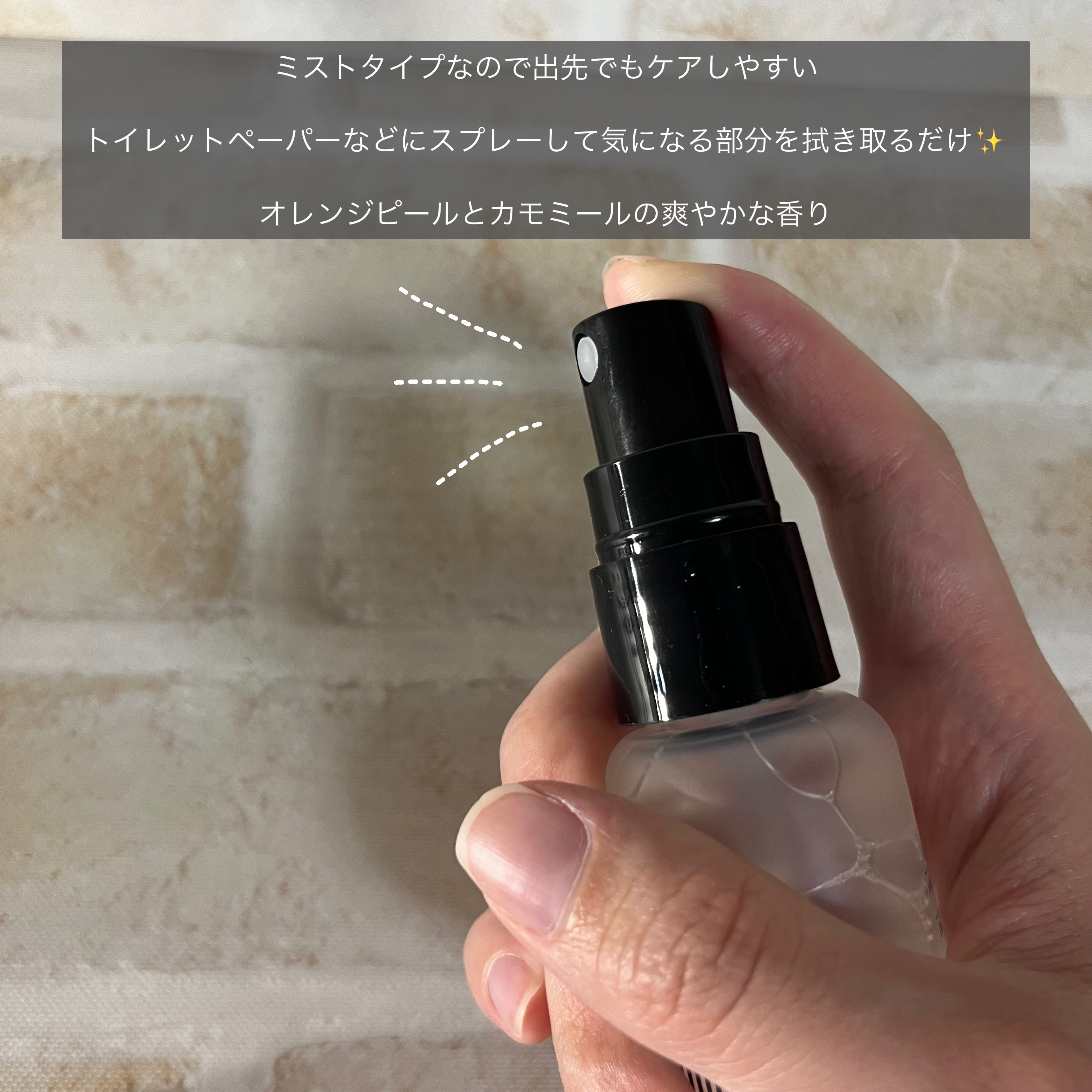 - 日常的なデリケートゾーンの不快感※1に、携帯できるミストで簡単拭き取りケア。 トイレットペーパーなどに吹きかけて、気になる部分を拭き取るだけ。 さわやかなオレンジピールとカモミールの香りをメインに、 8種の天然精油配合※2 でデリケートゾーンの気になるニオイもカバーします。 ※1:汚れによる ※2:オレンジ果皮油、ティーツリー葉油、エンピツビャクシン油、 グレープフルーツ果皮油、ラベンダー油、ハッカ油、セイヨウハッカ油、ローマカミツレ花油