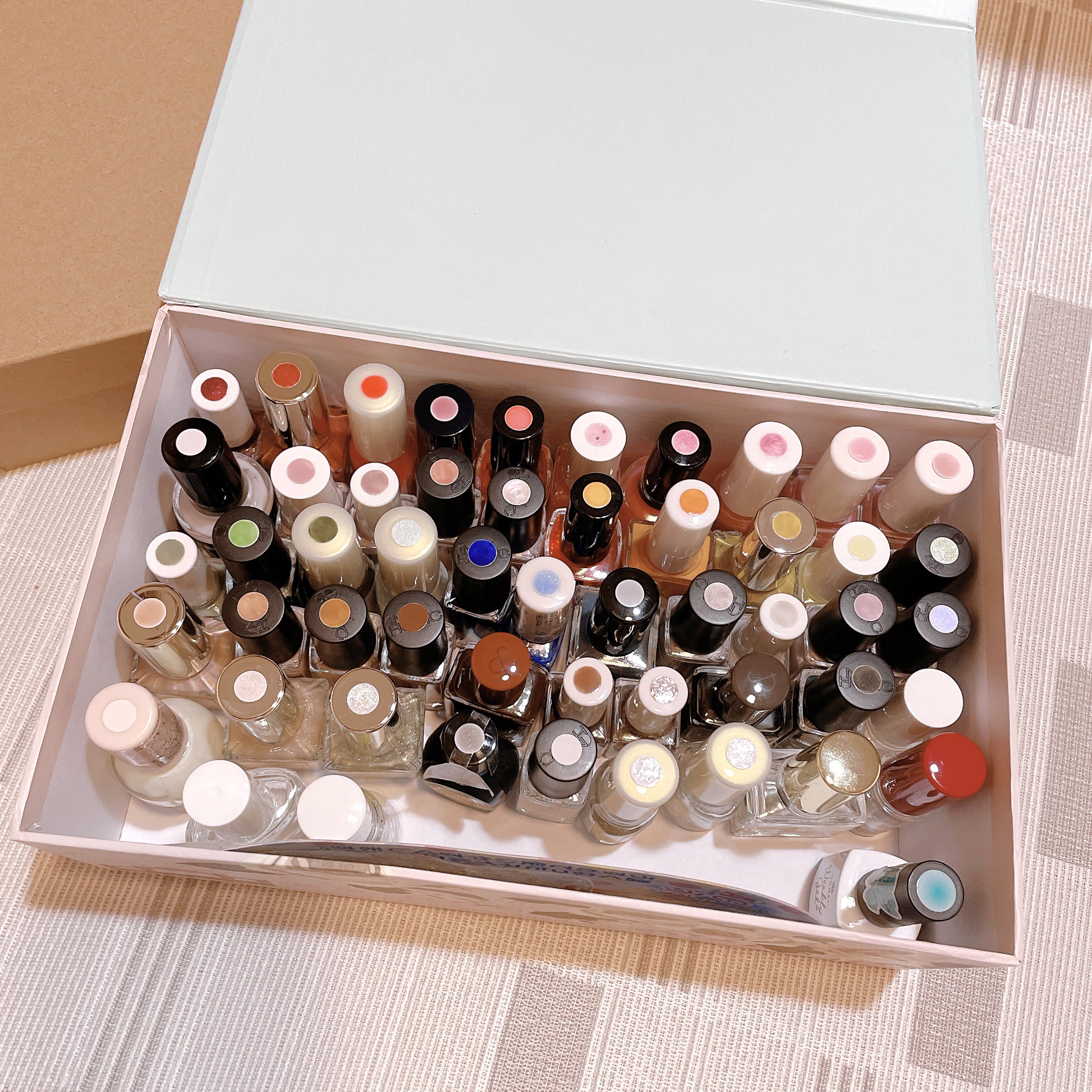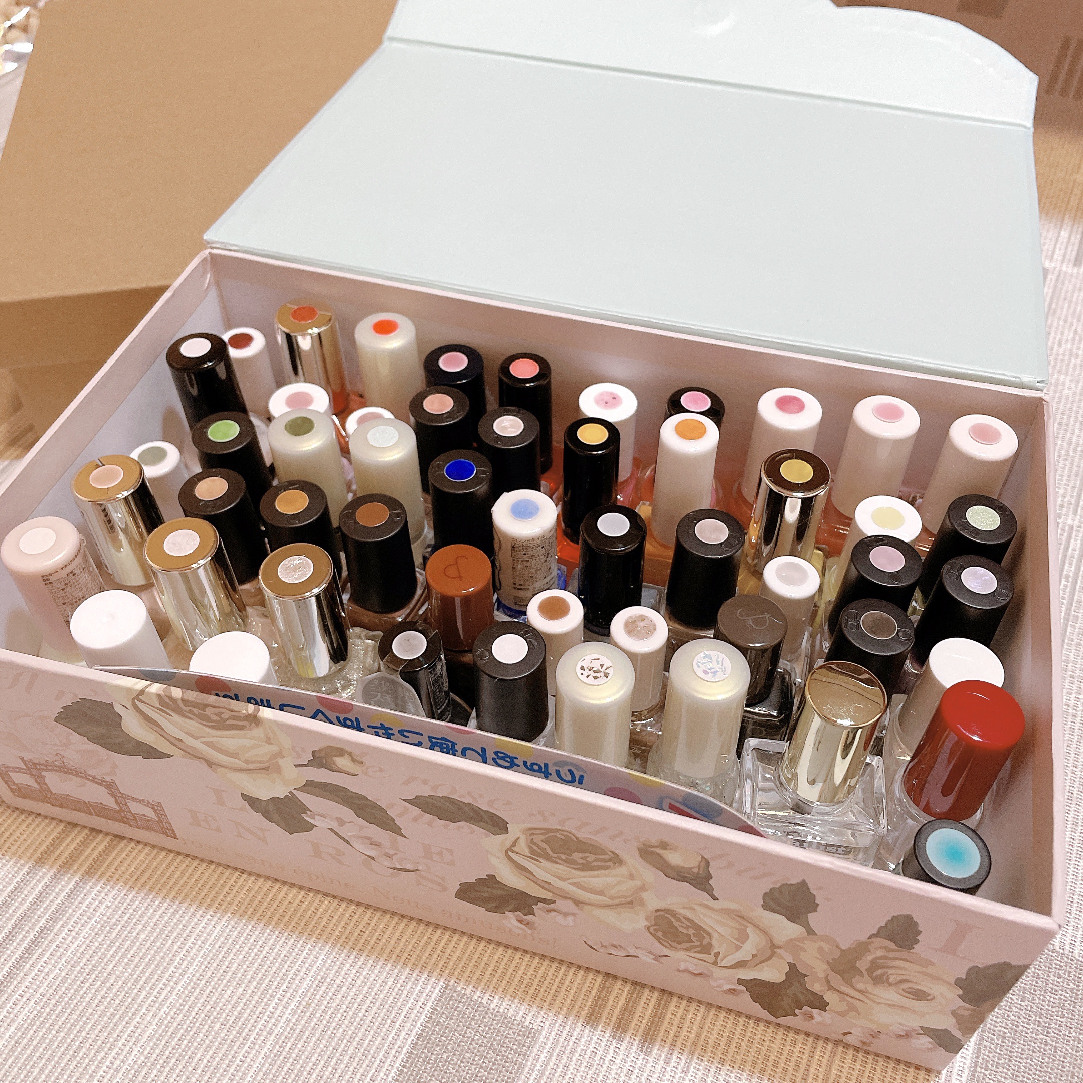 手持ちのネイルが少ない頃は、クリアケースに並べて見せる収納を楽しんでいたのですが、すっかりセルフネイルにハマり、ものが溢れてきたので今はボックスにまとめて保管しています(。•ᴗ•。)✨ 収納グッズはすべて100円ショップで揃います🍀*゜ ネイルしよう!と思ったらこれ一つを持ってくればいいので移動・準備が楽!