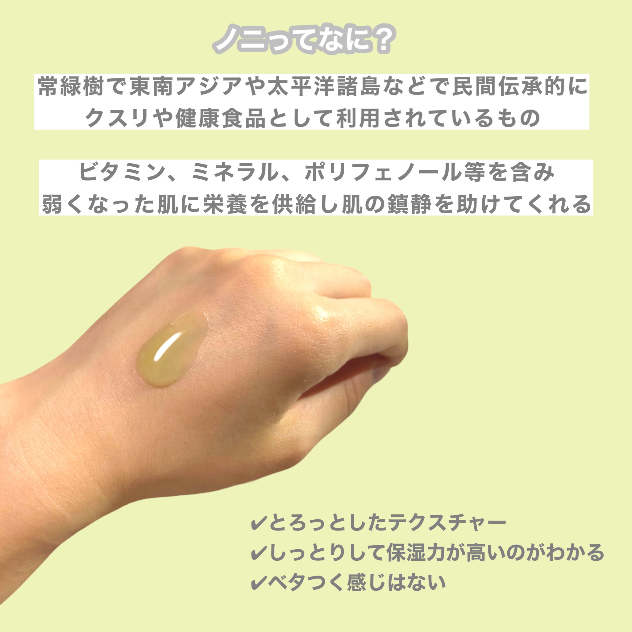 - <Noni Ampule> ノニ果実エキス(71.77%)、BG、プロパンジオール、グリセリン、1,2-ヘキサンジオール、コ ハク酸ジエトキシエチル、(アクリル酸グリセリル/アクリル酸)コポリマー、ノニシードオイル (1ppm)、セラミドNP、オリーブオイル、シア脂、スクワラン、ローズマリーリーフオイル、ニー ムリーフエキス、ニーム花エキス、カカオエキス、デキストリン、フィトスフィンゴシン、コレステ ロール、ヒアルロン酸Na、水添レシチン、(C12,13)パレス-9、ポリアクリロイルジメチル タウリンNa、トリ(カプリル/カプリン酸)グリセリル、精製水、アラントイン、アデノシン、ED TA-2Na、クロルフェネシン