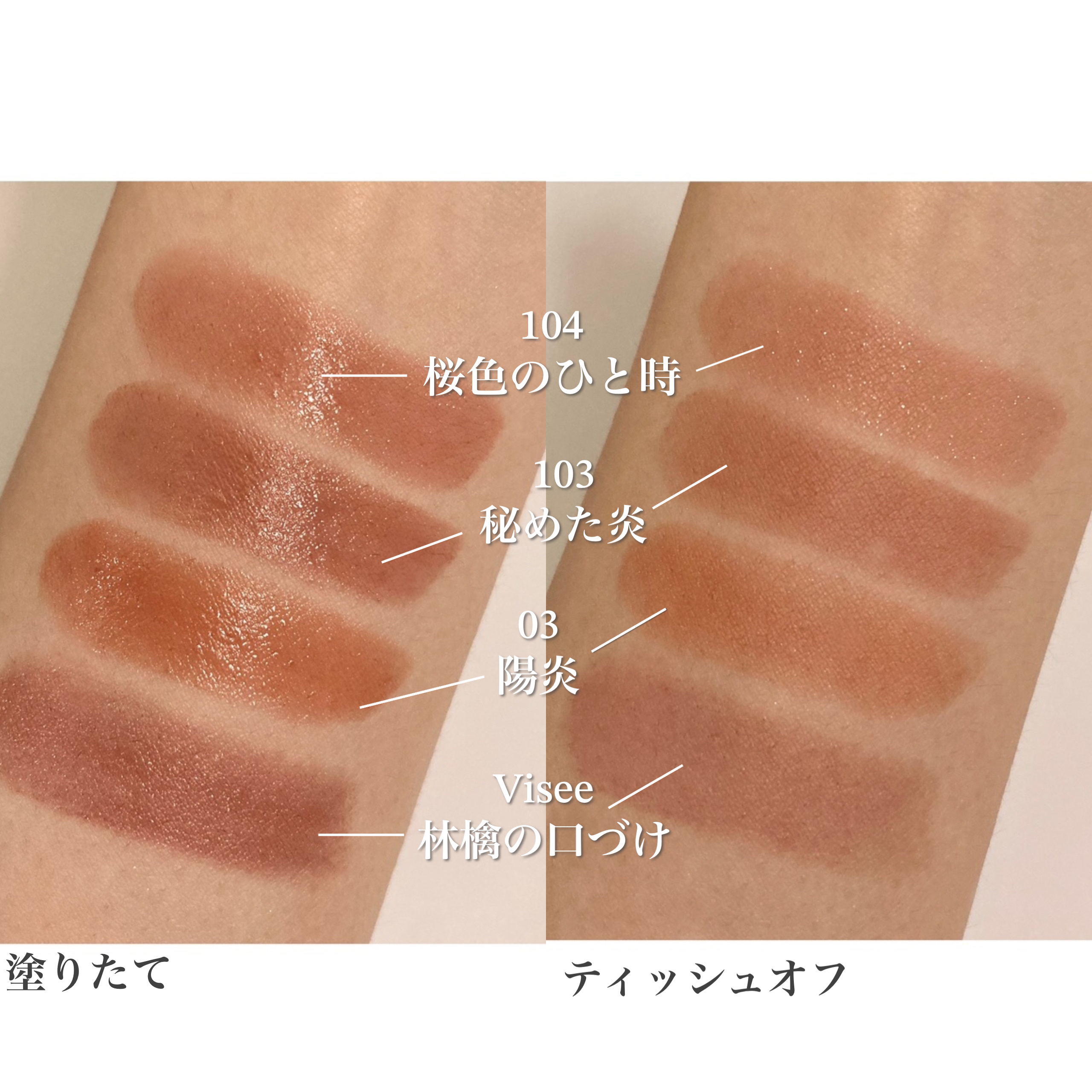 ラスボスは紅折り紙よりも明るく、くすみ弱めの青みレッド。 誓いのルビーは逆に紅折り紙よりもかなり暗くボルドー寄り。 チェリーの自惚れは色味がいちばん紅折り紙と近いかも。しかし質感が全く違うので印象がかなり変わります🥺 リップモンスターはツヤツヤ透け感のある仕上がりの一方、ネンマクフェイクルージュはツヤ感が弱いもののしっとりしっかり染め上げてくれるイメージ。 どちらかというとマット寄りのチェリーの自惚れの方が落ち着いて見えるかもしれません。 ティッシュオフしてみると、青み深みが残る誓いのルビーがいちばん似た色になるという結果に!誓いのルビーの方がかなり深くはあります。 ラスボスはやや明るくニュートラルに、チェリーの自惚れは赤というよりはピンク系になりました。