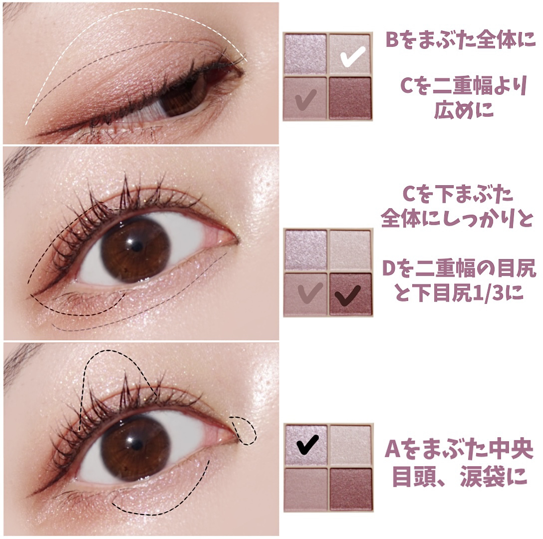 - ラメ・パール・マット3質感の4色アイシャドウ。 肌馴染みの良いベージュを基調としたカラー。ラメ・パール・マットの3質感を重ねて、自然にまぶたを強調し奥行のある大きな目元へ。 しっとり溶け込むような柔らかなパウダーなので、スルスル伸びてまぶたにピタッと密着。保湿成分(スクワラン・ホホバ種子油)配合。