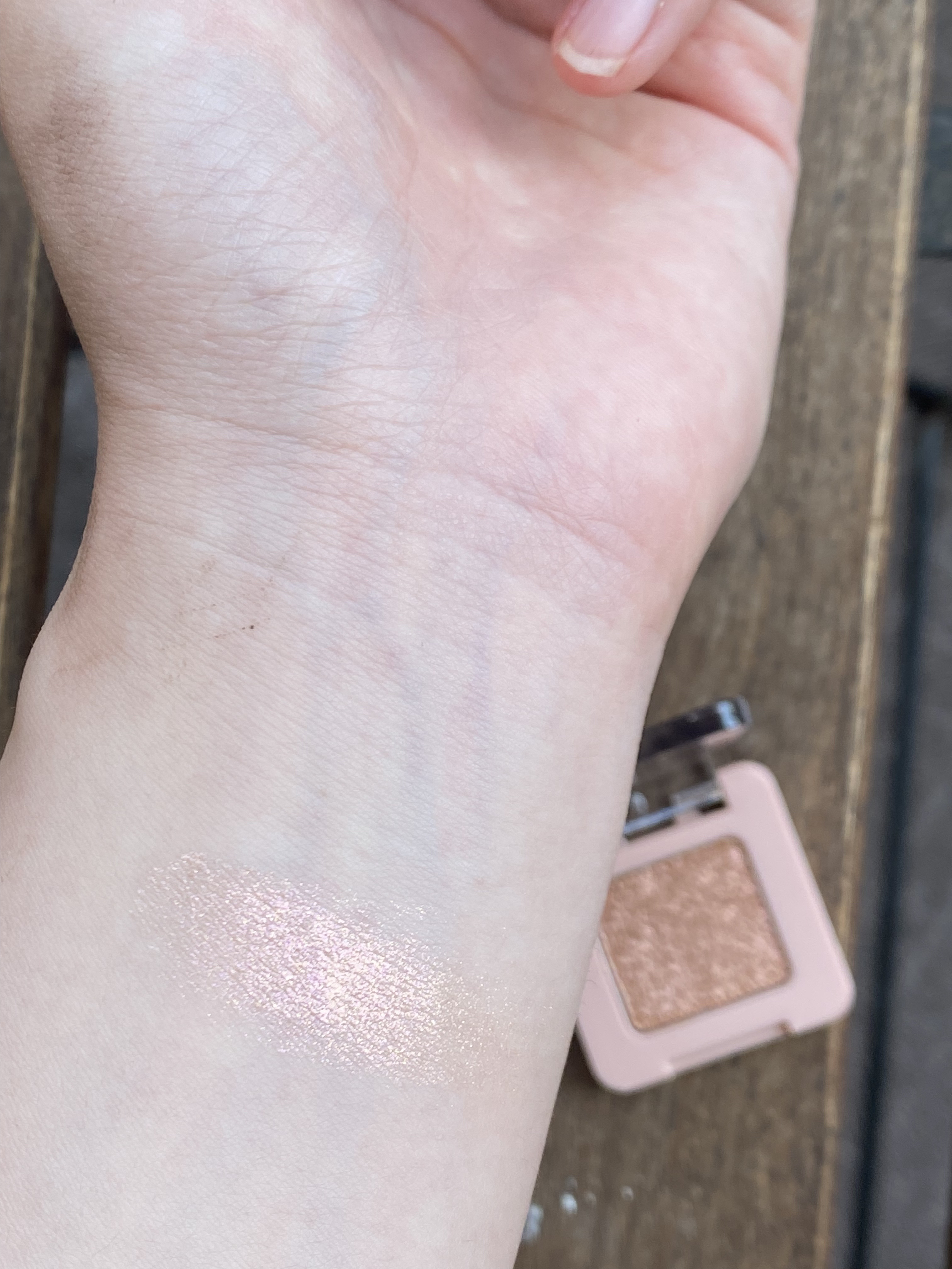 アンティーク感のある落ち着いたトーンのゴールド。メタリックの光沢感が強く、とても華やか。シャープな印象になり、モードなメイクに向いてそう。しっかりぼかすと光沢感がソフトな印象になります。テクスチャーはやわらかめでしっとり。ファーストタッチで指...