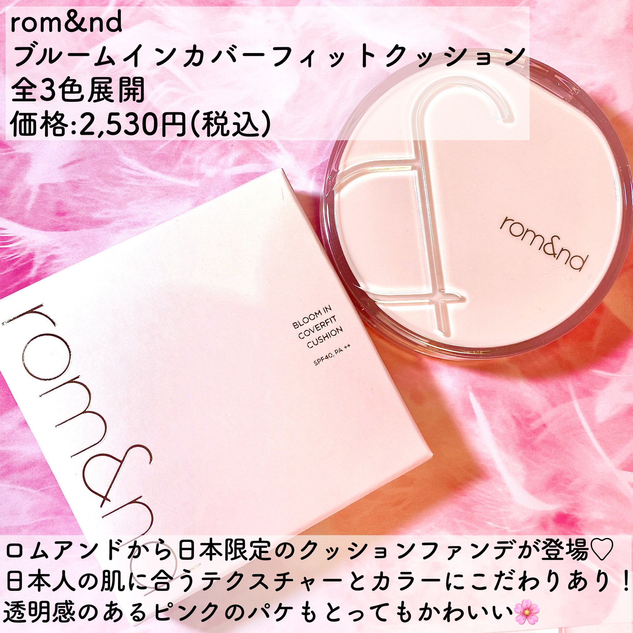 こんばんは🌙今回はrom&ndのブルームインカバーフィットクッション19Cピュアをご紹介します💗💗こちらは、ロムアンドのラッキーバッグに入っていました✨️外箱にひよんちゃんが載っていて、ひよんちゃんオススメの日本人向けに作られたクッションファ...