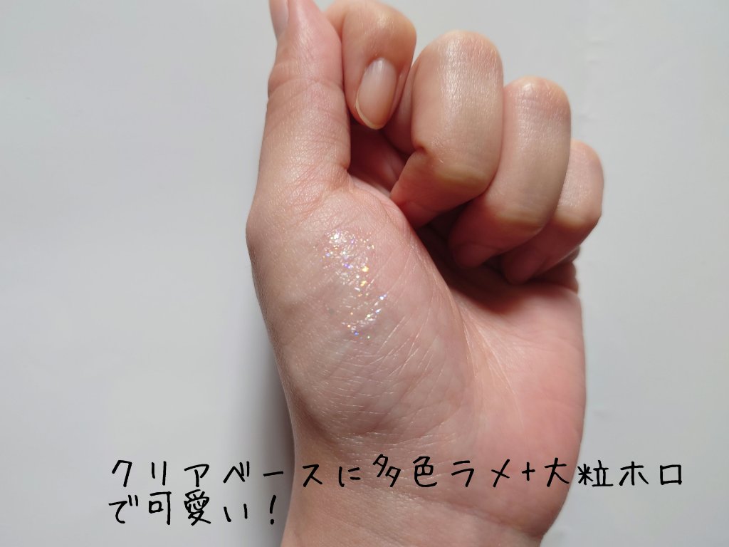 大きめなラメや細かなラメ、様々なサイズのラメが入っていて ひと塗りするとすごくキラキラします✨ ティッシュオフすると結構取れてしまうのとポロポロとその辺にラメが散らばっていました🙈 110円でお買い求めしやすいのとキラキラ輝いて可愛いので違うカラーも気になります♪