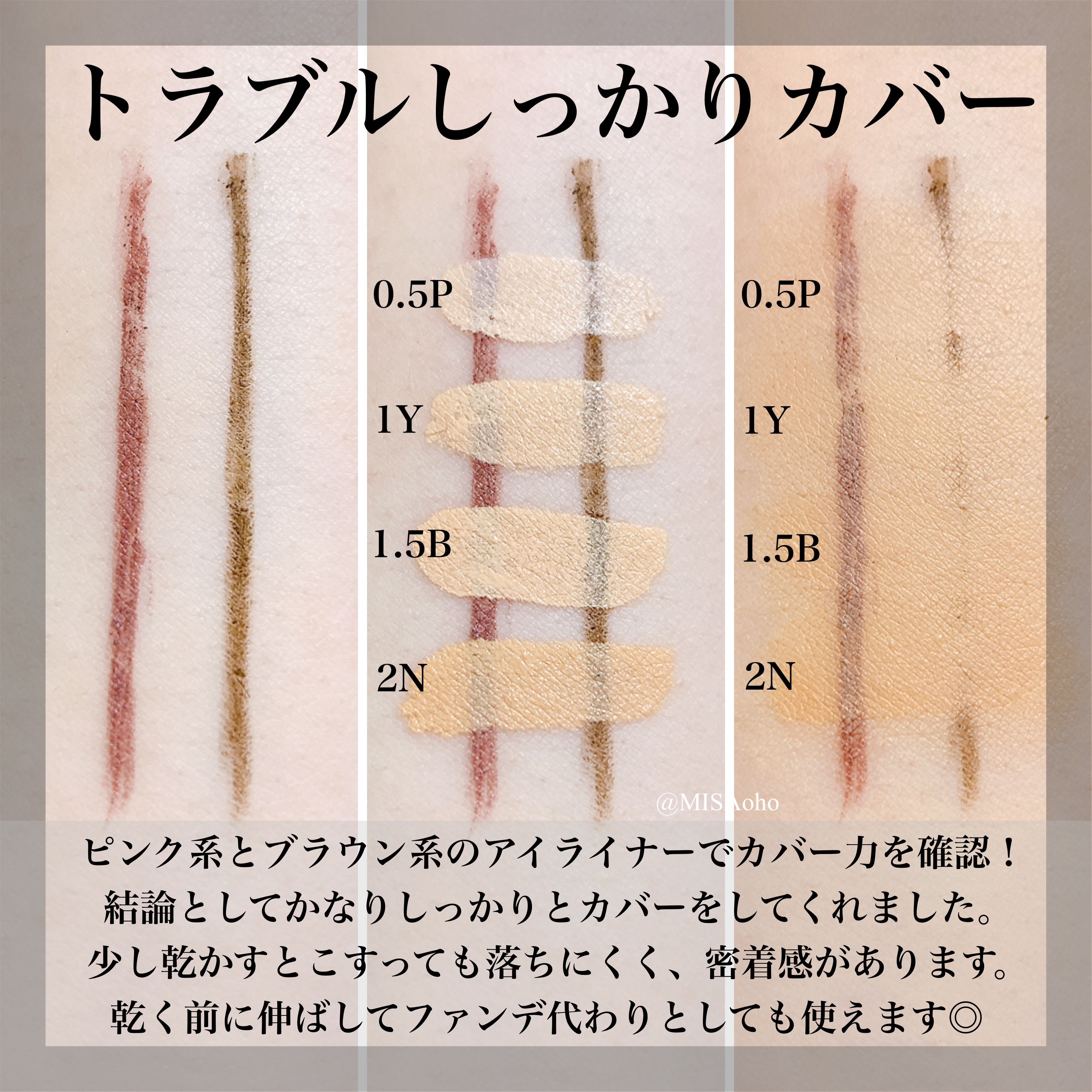 使用感で驚いたのはそのみずみずしさ! それこそプライマーを使用しているような感覚です。 カバー力はそれほど高くなく、ナチュラルでツヤ感のある仕上がりが好みの方におすすめ😆 使用後は少しペタッとした感覚が残ります。みずみずしさが高い分、乾燥しやすい方にはおすすめですが、脂性肌さんには少し重いのかなと感じました。