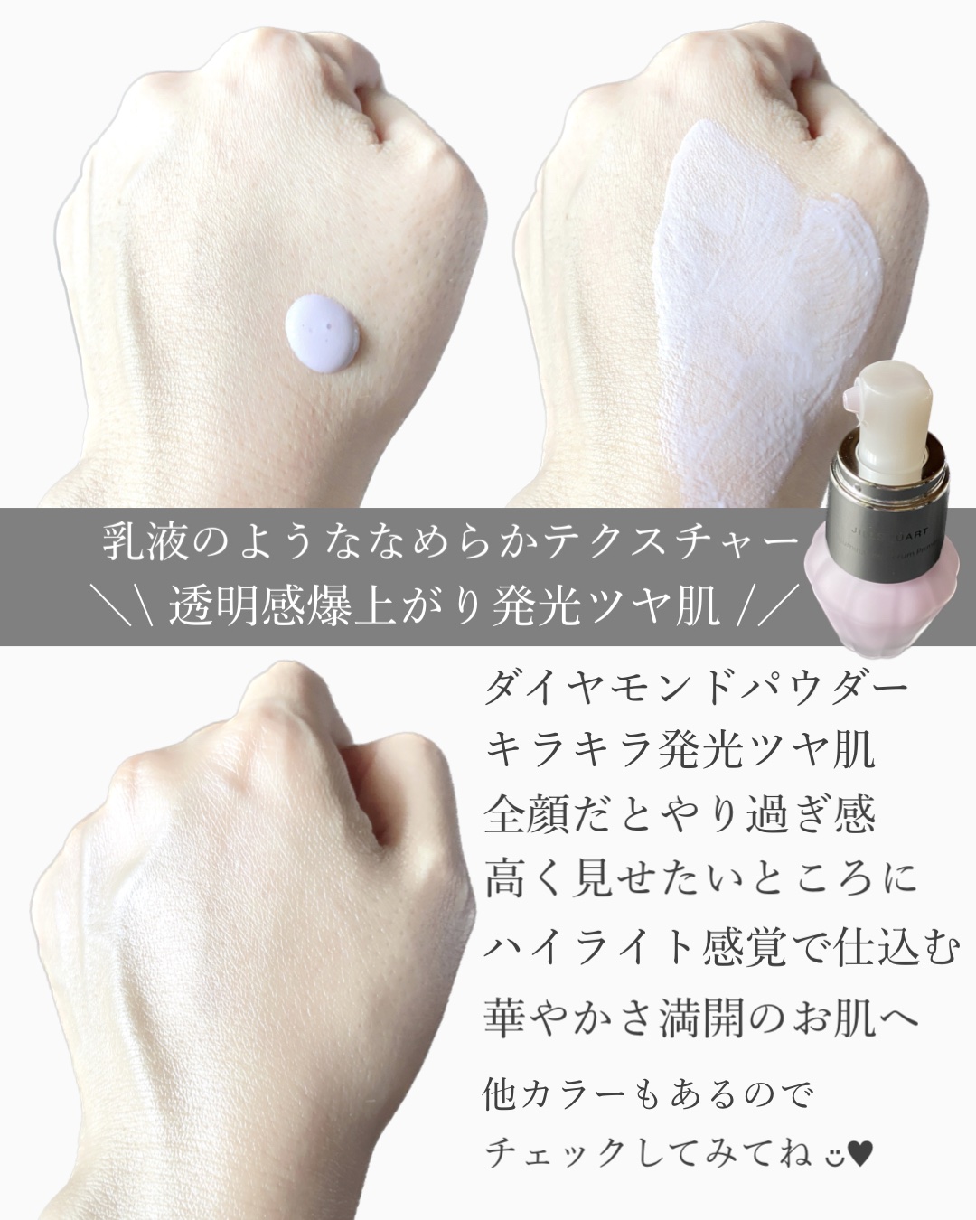 華やかなラベンダーカラーがくすみ肌に光を与え、透明感を纏った肌に💜 肌にのせるとオーロララベンダーパールとダイヤモンドパウダーが華やかに輝き明るい肌に✨ 光が当たったときのツヤ感の美しさはどの下地にも真似できないです💖