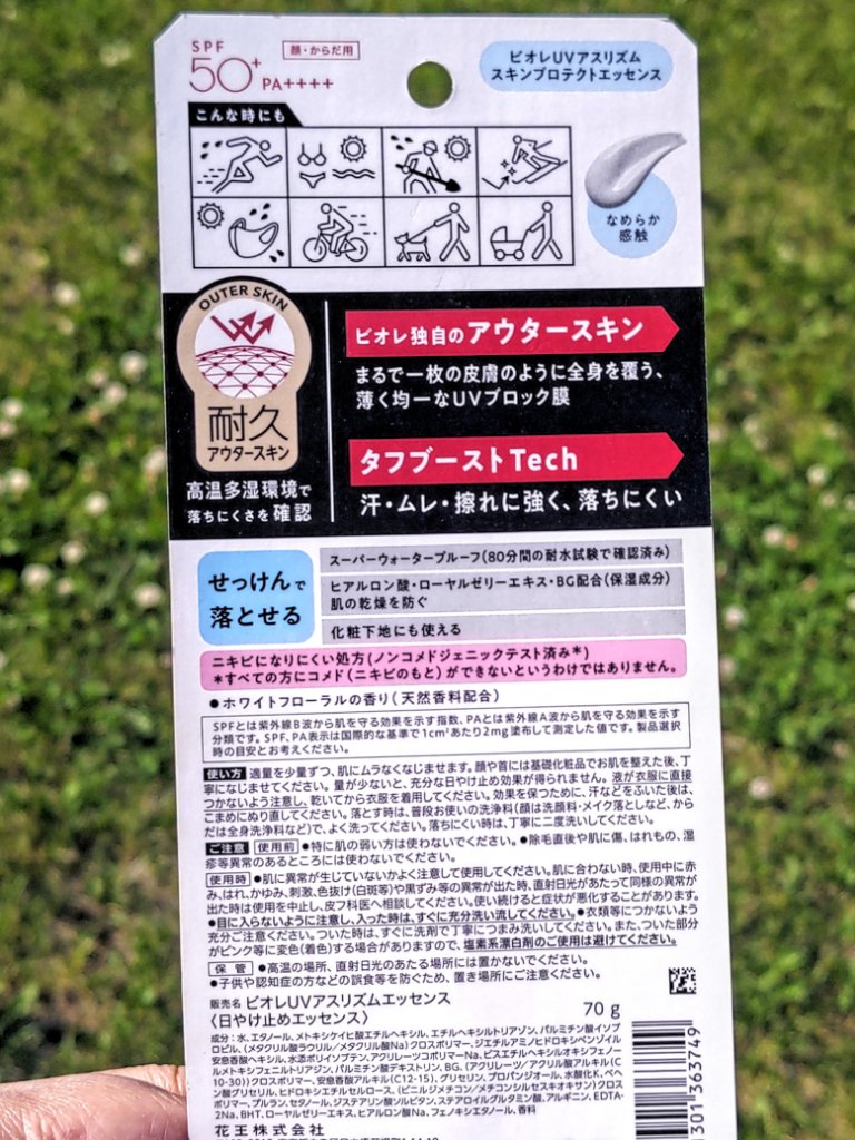 - 過酷な環境*1にも耐える、最高クラス*2UV。 高温多湿環境で落ちにくさを確認。汗・擦れに強く落ちにくい「タフブーストTech」採用。 肌になじんだ後に“なめらかな肌感触”に変わる、モイストタッチエッセンス。 肌の乾燥を防ぐヒアルロン酸・ローヤルゼリーエキス・BG配合(保湿成分)。 ◆SPF50+/PA++++ ◆スーパーウォータープルーフ(80分間の耐水試験で確認済み) ◆せっけんで落ちる ◆化粧下地にも使える ◆ホワイトフローラルの香り(天然香料配合) ◆にきびになりにくい処方(ノンコメドジェニックテスト済み*3) *1 高温多湿環境(40℃、湿度75%) *2 ビオレUVシリーズ内における、UVカット効果(SPF50+ PA++++)および、高温多湿環境での塗膜の落ちにくさ *3 すべての方にコメド(ニキビのもと)ができないというわけではありません。