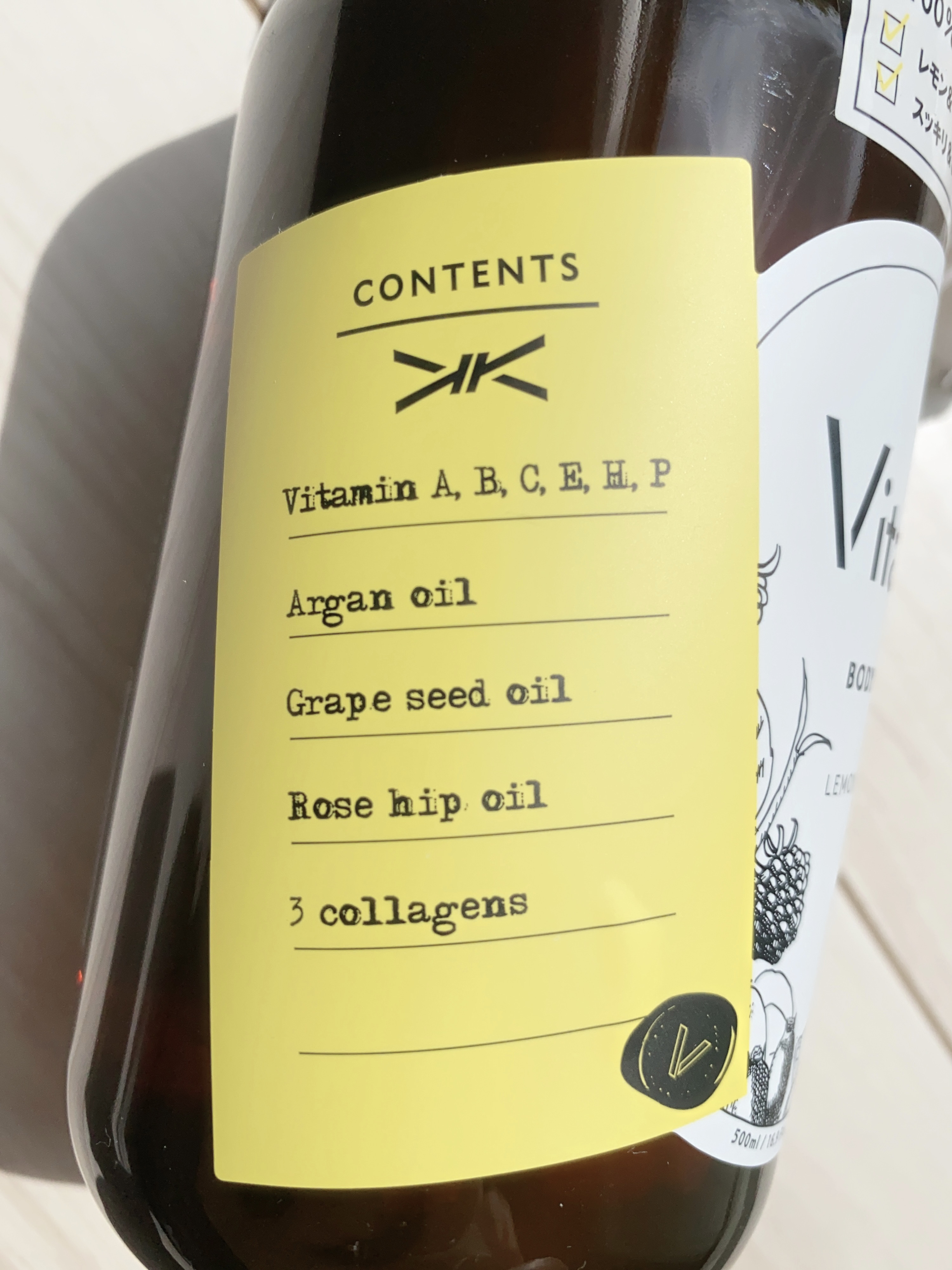 - 水、ラウリン酸、ミリスチン酸、水酸化K、ラウリルベタイン、グリセリン、コカミドDEA、香料、ラウラミドDEA、BG、グルコシルヘスペリジン、アセチルヒアルロン酸Na、PCA-Na、シロキクラゲ多糖体、パルミチン酸アスコルビルリン酸3Na、リンゴ果実培養細胞エキス、アルギニン、イチゴ果実エキス、アスパラギン酸、PCA、チャ乾留液、チョウジエキス、ライム果汁、チャ葉エキス、ビワ葉エキス、オレンジ果汁、グリシン、アラニン、アセロラ果実エキス、クダモノトケイソウ果実エキス、ヒアルロン酸Na、レモン果汁、ウコン根茎エキス、セリン、バリン、キイチゴエキス、イソロイシン、トレオニン、プロリン、グレープフルーツ果実エキス、サンザシエキス、ナツメ果実エキス、リンゴ果実エキス、サクシノイルアテロコラーゲン、ヒスチジン、フェニルアラニン、ブドウ果実細胞エキス、ユズ果実エキス、オリゴペプチド-20、イソマルト、加水分解ヒアルロン酸、加水分解コラーゲン、水溶性コラーゲン、パンテノール、ビオチン、アボカド油、アルガニアスピノサ核油、カニナバラ果実油、シア脂、ブドウ種子油、パルミチン酸レチノール、セラミドNP、ステアリン酸、ラウリン酸BG、乳酸Na、アルガニアスピノサカルス培養エキス、ヒドロキシプロピルメチルセルロース、キサンタンガム、ココイルグリシンNa、ポリソルベート20、レシチン、エタノール、コーン油、クエン酸、テトラヘキシルデカン酸アスコルビル、トコフェロール、安息香酸Na