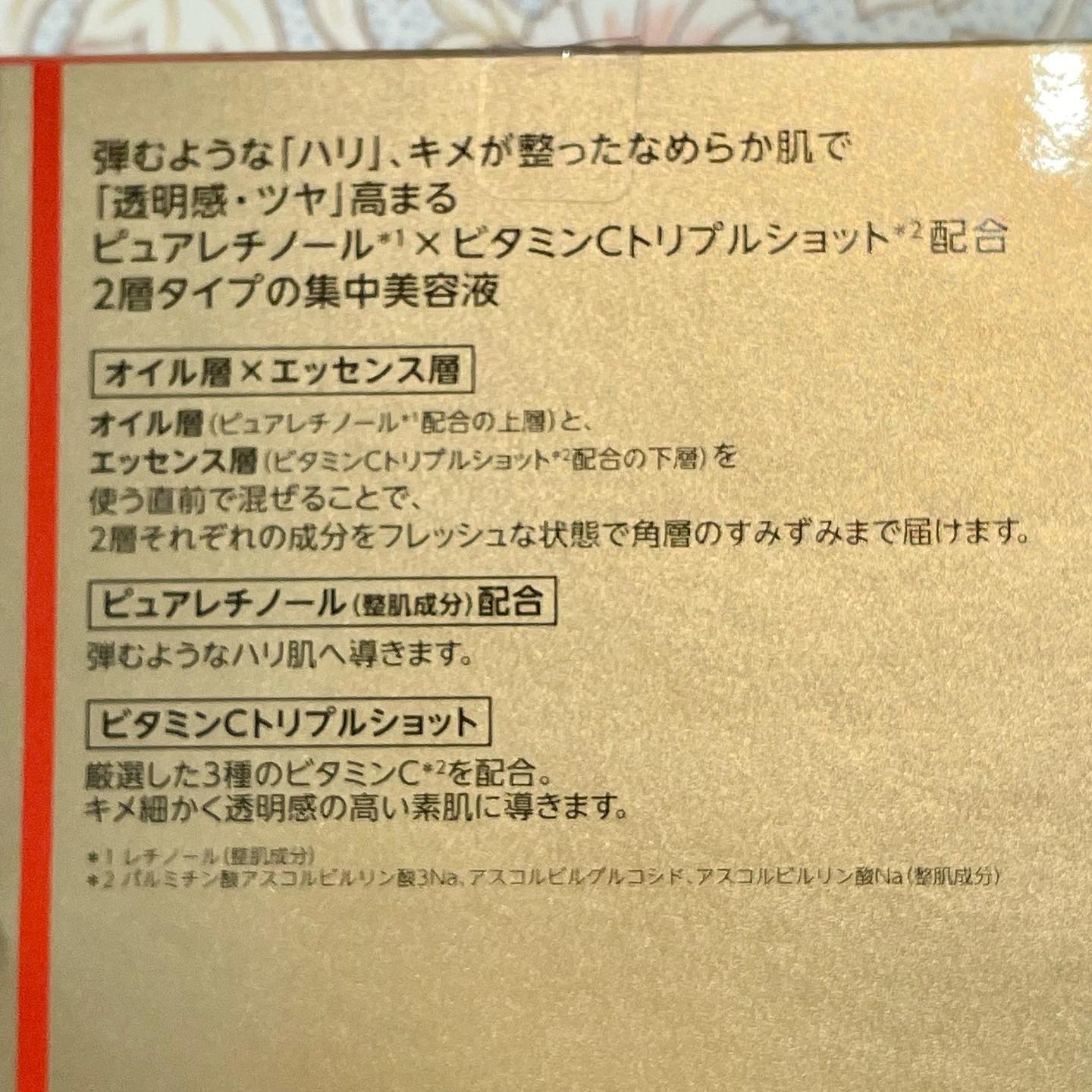 - 究極のコラボ。純粋レチノール(整肌成分)×高浸透ビタミンC(APPS)(整肌成分)同時配合。 肌内側の【ハリ・弾力】も、肌表面の【うるおい・毛穴・キメ・くすみ】にも働きかける2大成分。同時に届けるからこそ、補い合いながら肌をサポート。 弾むハリ・透明感を。 2秒で生まれたて:使用の度に2秒間シェイクするだけで1つの美容液が生まれること。 究極のコラボ:当社の長年にわたるレチノールおよびビタミンC研究の集大成。 ビタミンC、高浸透ビタミンC(APPS):パルミチン酸アスコルビルリン酸3Na 肌内側:角層 浸透:角層まで 毛穴・くすみ:うるおい不足による 透明感:うるおいによりキメが整いツヤのある肌