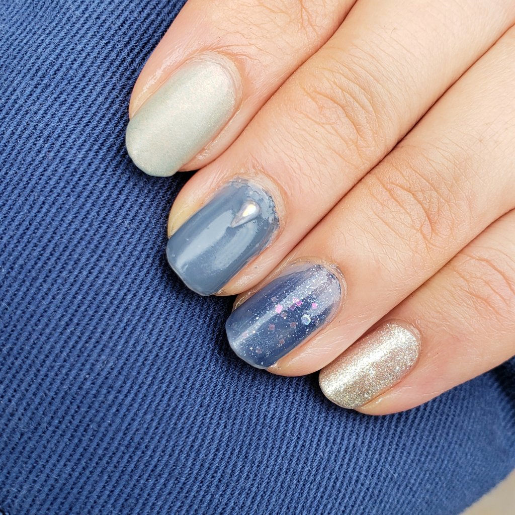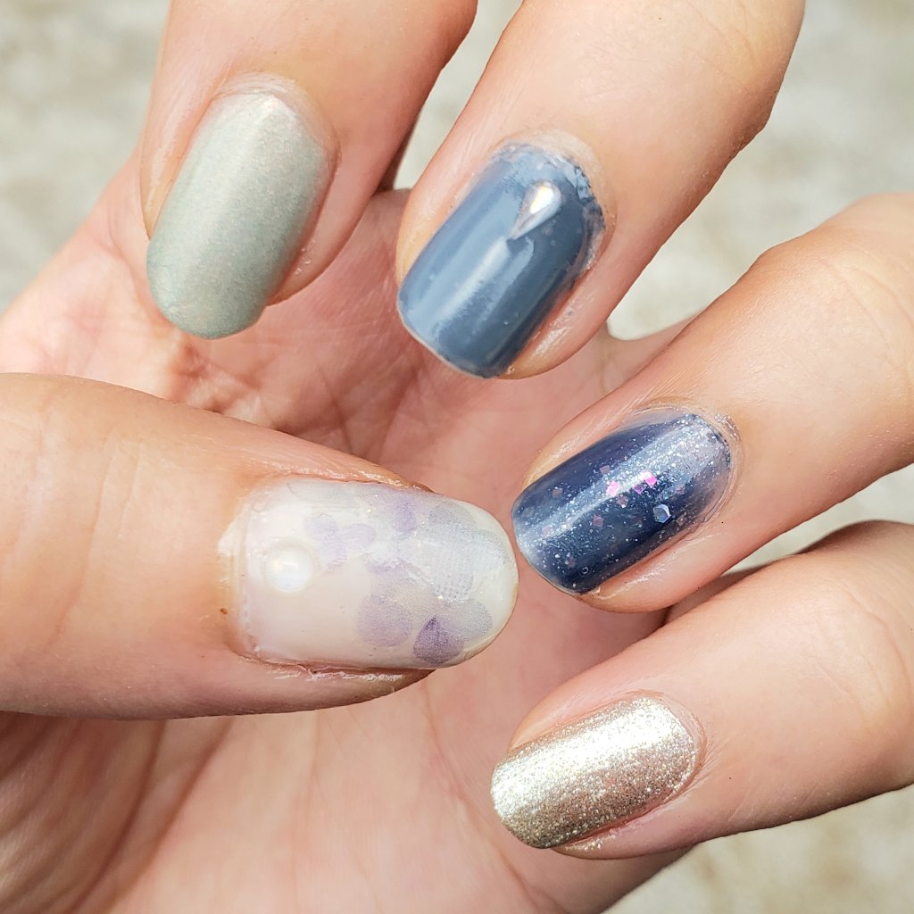 紫陽花ネイル青バージョン。 花のシールだけじゃなくて、グリーンも取り入れたところが今回のお気に入りポイント。 ✼••┈┈••✼••┈┈••✼••┈┈••✼••┈┈••✼ 【使ったもの】 デュカート N55 コンデンスミルク パラドゥミニネイル BL09 ミッドナイトロマンス paプレミア AA120 トゥインクルネイビー ネイルホリック GR728 キャンメイク N20 ゴールデンビジュー paプラス ピールオフベースコート ネイリストクイッククリスタルコートⅡ ネイルホリック SP011 マットトップコート ネイルシール各種(セリアにて購入) 【やり方】 ⭐️紫陽花ネイル 1.デュカートN55コンデンスミルクを4度塗り 2.クイッククリスタルコートⅡを1度塗り 3.紫陽花のシールを貼り付け 4.オーロラストーンを貼り付け 5.トップコートで仕上げ 🔹ポイント ・紫陽花のシールは根元側に余白を残すように貼る ・仕上げのトップコートはオーロラストーンの上には塗らないように、周りだけ塗る ⭐️ブルーネイル① 1.パラドゥミニネイルBL09ミッドナイトロマンスを1度塗り 2.paプレミアAAA120トゥインクルネイビーを重ねて1度塗り 3.トップコートで仕上げ ⭐️ブルーネイル② 1.ミッドナイトロマンスを2度塗り 2.クイッククリスタルコートⅡを1度塗り 3.シールを貼る 4.トップコートで仕上げ ⭐️グリーンネイル 1.ネイルホリックGR728をたっぷりめに2度塗り 2.クイッククリスタルコートⅡを1度塗り 3.ネイルホリックSP011マットトップコートを1度塗り ⭐️ラメネイル 1.キャンメイクN20ゴールデンビジューを2度塗り 2.トップコートで仕上げ ✼••┈┈••✼••┈┈••✼••┈┈••✼••┈┈••✼ 先週の日曜日のネイル。 お気に入りの浴衣を着て出掛けたので、ネイルも色を合わせてみた✨ カラフルだけど、基本はベタ塗りしていくだけ。 色選びが楽しいネイルだった🎶 こういう寒色好きだなぁ。 寒色と言えば、デュカートとキャンメイクから発売の新色がどちらも夏の空をイメージした寒色!! 全部欲しい、指が足りない、でも全部欲しい!!笑 #セルフネイル #ネイル記録