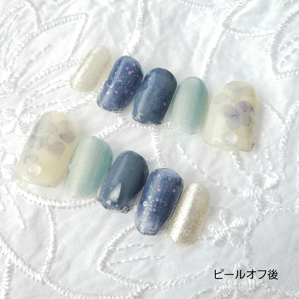 セルフネイルのネイルデザイン - 紫陽花ネイル青バージョン。 花のシールだけ