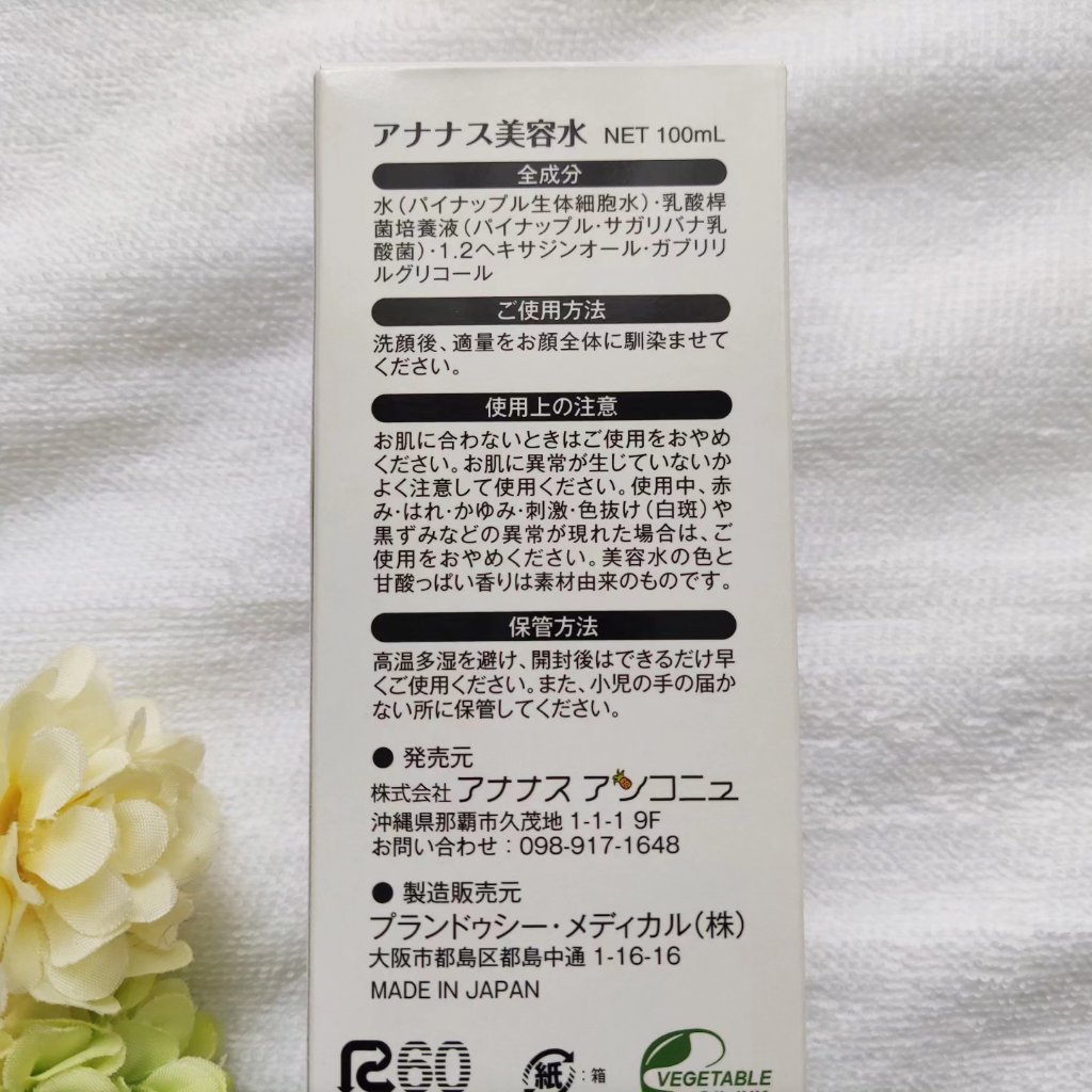 - <100ml> 水(パイナップル生体細胞水)、乳酸桿菌培養液(パイナップル、サガリバナ乳酸菌)、1.2ヘキサジンオール、カプリリルグリコール
