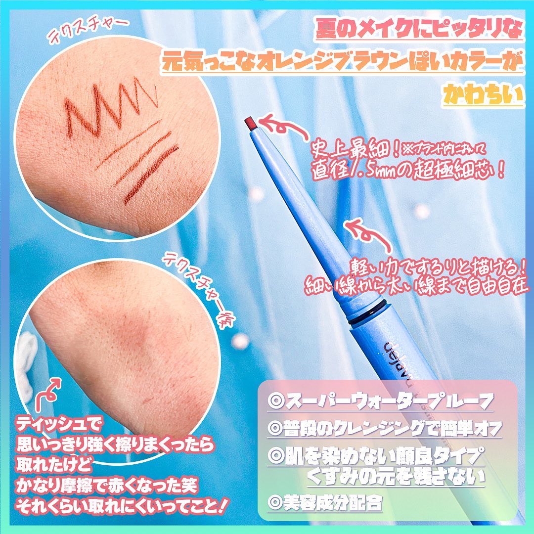- ”なめらかなのに にじまない”クリームペンシル極細芯タイプ ・史上最細!*直径1.5㎜の超極細芯 ・自然なラインが長時間続く**スーパーウォータープルーフタイプ ・肌当たりが非常にやさしく、なめらかに描ける処方を採用 *ブランド内において **効果には個人差があります